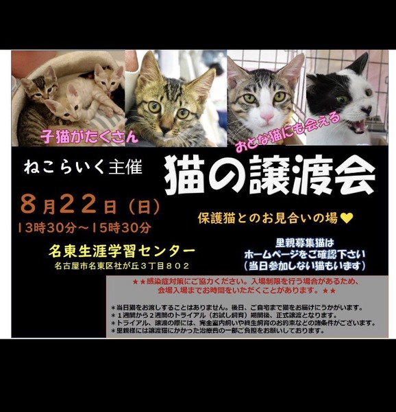 | イベント内容 | 「猫の譲渡会」 日にち:2021年8月22日(日) 時間 :午後1時30分~3時30分 会場 :名東生涯学習センター 名古屋市名東区社が丘3-802 予約不要です *駐車場有(300円/日) 満車の場合は猪高緑地公園駐車場(無料)も ご利用になれます 生涯学習センターの受け付けに案内用地図が 用意されています 主催:ねこらいくnenet https://nekonetwork.com/ 募集猫中の猫は https://nekolike.amebaownd.com/ ―------- *子猫参加します 上記ブログで紹介しています 猫の急な体調変化により参加できない 場合もあります。 ご了承いただきますようお願いします。 実際に猫を見てから考えたい 飼育の仕方について質問したい・・・など すぐに決められない方でも結構です ぜひ、譲渡会におこしください 〇室内飼い、家族全員の同意、治療費の負担など お願いごとがあります 〇1~2週間のお試し飼育期間があります 〇当日、猫を連れて帰ることはできません *感染症対策を実施しています ・会場入出時の手の消毒、検温にご協力ください ・常時、窓を開け換気をしています ・スタッフはマスクを着用し、ご入場の方にもマ スクの着用をお願いしています ・室内への入場は一定の人数とさせていただきます |