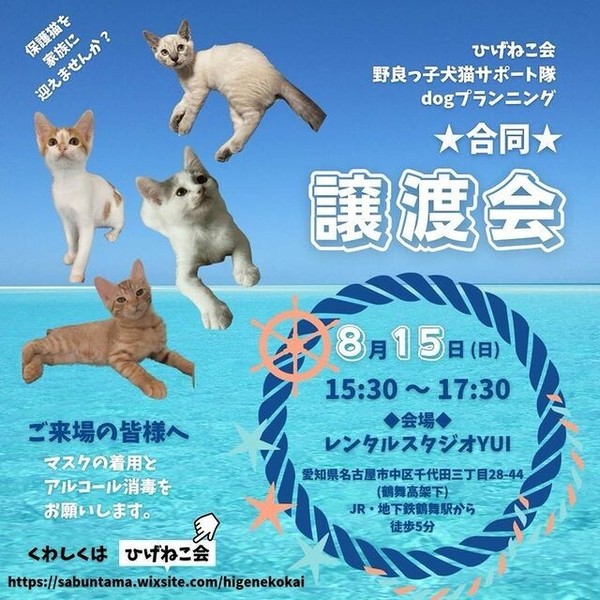 | イベント内容 | ひげねこ会・野良っ子犬猫サポート隊・ドッグプランニング 合同で譲渡会を開催します。 2ヶ月弱からの子猫達が参加します ドッグプランニング☆インスタグラム https://www.instagram.com/yuko9124/ 野良っ子犬猫サポート隊☆アメブロ https://ameblo.jp/norakoinuneko/ ひげねこ会HP https://sabuntama.wixsite.com/higenecokai ☆会場 愛知県 名古屋市中区千代田三丁目28-44 レンタルスタジオYUI(鶴舞高架下) ☆15:30~17:30 JR・地下鉄鶴舞駅から徒歩5分 ☆駐車場 鶴舞交差点~南のJR中央線ガード西側道路は休日駐車禁止解除になっています。 (休日駐禁解除区間に空きが無い場合は、コインパーキングをご利用ください。) 事前の申込みは不要です。 ☆皆様のお越しをお待ちしています☆ |