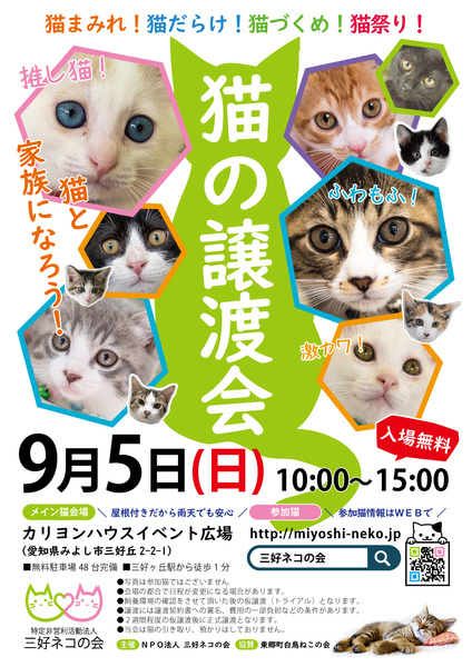 | イベント内容 | ★子猫26匹★子猫26匹★子猫26匹★ 子猫パワーで残暑を乗り切ろう!! 子猫ばかり癒しの譲渡会です。 9月を過ぎると子猫が少なくなります。 家族の一員、家族候補に会いに来てください。 <猫と家族になろう~> 9月5日(日)10時~15時 愛知県みよし市三好丘2-2-1 三好ヶ丘カリヨンハウスイベント広場 (エアコン完備で涼しい!!) ●譲渡が決まると猫トイレ、トイレ砂5L×2袋をもれなく進呈。 1匹につき1セットご提供、複数の場合は頭数分をご提供します。 http://miyoshineko.sblo.jp/article/188311208.html 【来場前にご確認ください】 スタッフと来場者の安全のためにコロナ対策を強化します。 会場前で整理券をお渡し後、順番にご案内いたします。 入場をグループ制とさせていただき、各グループ10人程度、会場内の滞在時間を30分程度に制限します。 猫は早いもの勝ちではございません 主催:NPO法人三好ネコの会 http://miyoshi-neko.jp |