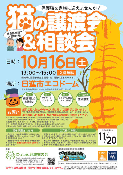| イベント内容 | ★★★ 9月18日(土)猫の譲渡会&相談会は、愛知県緊急事態宣言延長に伴う施設使用制限のため、中止となりました ★★★ 10月16日(土)に「猫の譲渡会」を開催いたします。 猫少なめのミニ譲渡会&相談会です。 保護猫を迎えたい方はもちろん、ご近所との猫トラブルなどでお悩みの方もお立ち寄りください!(^^)/ 緊急事態宣言中は開催中止となります。 また、感染症拡大防止のため、入場に際して制約がございますので、ご理解・ご協力をお願いいたします。詳細は、ホームページにて随時更新いたします。 【日時】2021年10月16日(土)13:00〜15:00 【会場】日進市エコドーム(中央環境センター) ※入場無料・予約不要です。 ※ペット同伴のご入場はできませんので、予めご了承ください。 ※猫ちゃんの譲渡には条件がございます。詳細はホームページをご参照ください。 ※車でお越しの方は、日進市役所の駐車場をご利用ください(徒歩1分)。エコドームの駐車場は、ごみを持参される方専用のため、利用できません。ごみの処分を兼ねてお立ち寄りくださる場合でも、誠にお手数ですが、ごみ処分後にお車を日進市役所の駐車場へ移動していただきますよう、どうぞご協力をお願いいたします。 【主催】にっしん地域猫の会 【ホームページ】http://nissinchiikineko.main.jp |