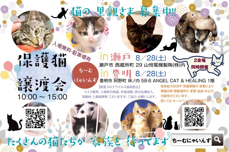 | イベント内容 | 2021年8月28日(土)の10時~15時に、 愛知県瀬戸市西蔵所町29 山悦電機製陶(株)内 ※駐車場あり(14台) と、 愛知県豊明市阿野町林ノ内58-6 猫カフェ『 Angel cat healing 』さん一階 ※駐車場有り(10台) にて、『子猫だらけの譲渡会』を同時開催します!! 当日は、数多くの子猫さん達(瀬戸会場40頭以上、豊明会場25頭以上)の参加を予定しておりますので、是非ともお越しください! 猫さんをお探しの方や、これから猫を飼ってみたいと考えられている方、更に色々な『ネコ話』を聞いてみたい方など、是非お気軽にお越しください! ※見学無料・来場予約不要です ※新型コロナウイルス感染症拡大防止の為、来場時のマスク着用・検温・アルコール消毒液での除菌・少人数(2~3組)ごとの入場・送風機による場内換気・お車での順番待ちなど、様々な制約が生じてしまいますが、何卒ご協力の方をよろしくお願いいたします。 ※コロナ3密対策のため、事前予約のない《他団体のメンバー様》につきましては、ご来場や相談等、一切の対応をお断りさせていただいております。 [主催] ちーむ にゃいんず (NPO 非営利団体) [開催日時] 2021年8月28日(土)10時~15時 [譲渡会場] 瀬戸会場 愛知県瀬戸市西蔵所町29 山悦電機製陶(株)内 ※駐車場あり(14台) 豊明会場 愛知県豊明市阿野町林ノ内58-6 猫カフェ『 Angel cat healing 』さん一階 ※駐車場あり(10台) ◎ちーむにゃいんず紹介ページ 新しくなりました! [ちーむにゃいんず公式サイト] http://cat-rescue-team.org/ 現在も随時更新中です!(旧公式HP) [ちーむにゃいんずamebaページ] https://team-nyainz.amebaownd.com/ 地域に愛される保護猫団体を目指します! [瀬戸観光協会公式HP内「ちーむにゃいんず」紹介ページ] http://www.seto-marutto.info/member-post/teamnyainz/ フォローをお願い致します [ちーむにゃいんずFacebookページ] https://www.facebook.com/teamnyainz [ちーむにゃいんず Twitter] https://twitter.com/nyains_seto お問合せ先 [譲渡会や里親さん希望の方のお問合せは↓] nekomadohouse@yahoo.co.jp [保護猫&活動ボランティア参加の希望の方は、こちらへ↓] nekomado1@yahoo.co.jp ★只今、保護猫ボランティアのメンバーを大募集中です! 現在のところ、主に瀬戸市内中心部と豊明市内で保護猫の譲渡会を定期開催致しておりますが、愛知・岐阜・三重を中心にした中部地方全域にその活動エリアを拡大中ですので、少し離れた方でも全然OKです! ※経験不問(未経験の方でも、サポートさせていただきます!) ・チビ猫さんのミルクボランティアさん ・子猫さん&成猫さんの預かりさん ・譲渡会当日の各サポーターさん(受付・場内案内・保護主さんのサポートなど) ・譲渡会以外の日の宣伝活動(各媒体での宣伝・チラシ&募金箱等の設置先紹介など) ・保護猫活動及びTNR活動時の捕獲・保護作業 その他、何らかの保護猫活動にメンバーとして協力していただける方は、下記のメールアドレスの方まで、お問い合わせください。 《お問合せ先》 NPO非営利団体 ちーむ にゃいんず nekomado1@yahoo.co.jp まで ★NPO非営利団体「ちーむにゃいんず」 ・瀬戸観光協会 指定(会員)登録団体 ・瀬戸市社会福祉協議会(会員)登録団体 ・瀬戸市民活動センター(会員)登録団体 ・豊田市愛護センター 登録団体 ・名古屋市愛護センター 登録団体 ・岐阜県保健センター(全11ヵ所)登録団体 ・岐阜市保健センター 登録団体 など ☆保護猫たちの為に、ご支援をお願いいたします☆ 三菱UFJ銀行 瀬戸支店(セト) 普通口座 0267649 口座名義 チーム ニャインズ ミナミ タカヒロ まで、よろしくお願いいたします。 |