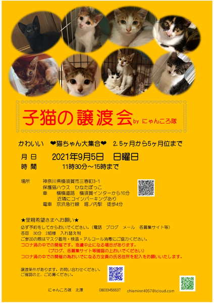 | イベント内容 | 子猫ちゃんの譲渡会を開催いたします。 2.5ヶ月位から5ヶ月位までの猫さん15匹位 月 日 2021年9月5日 日曜日 時 間 11時30分~15時まで 場所 神奈川県横須賀市三春町3-1 保護猫ハウス ひなたぼっこ 車 横横道路 横須賀インターから10分 近隣にコインパーキングあり 電車 京浜急行線 堀ノ内駅から徒歩4分 ★里親希望さまへお願い★ 必ず予約をしてからおいでください。 各回 30分 2組様 入れ替え制 ご参加の際はマスク着用・検温・アルコール消毒にご協力ください。 コロナ渦の中での開催です。急遽中止になる場合があります。 (ブログ、各募集サイト等確認の上おいでください) コロナ渦の中での開催の為おいでになる方全員の氏名住所を記入をお願いいたします。 譲渡条件があります。お問い合わせください。 ご確認の上、ご応募ください。 猫の譲渡条件 http://nyankorotai.blog.fc2.com/blog-category-5.html 上記の譲渡条件をコピーペーストして下記アドレスへ送ってください。 追ってご連絡いたします。 お電話にても受付いたします。 ご連絡お待ちしております。 担当 北澤(にゃんころ隊) chieminn4057@icloud.com 08033456637 にゃんころ隊 http://nyankorotai.blog.fc2.com/ |