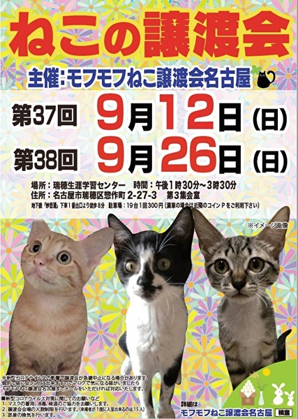 | イベント内容 | モフモフねこ譲渡会名古屋 猫たちの幸せなお家探しのために譲渡会を開催しております。 個人ボランティアの集まりです。 自分たちの出来ることから頑張っております! 一匹でも幸せになれる猫が増えますように 場所 瑞穂生涯学習センター 第3集会室 住所 名古屋市瑞穂区惣作町2-27-3 時間 13時30分~15時30分 交通機関等 地下鉄「妙音通」下車1番出口より徒歩8分 駐車場19台(満車の場合は近隣コインPをご利用ください) 参加猫の情報は下記モフモフねこ譲渡会名古屋ブログにてご確認ください。 https://mofumofuneko4.fc2.net/ 新型コロナウイルス対策として ・会場は換気を定期的に行います。 ・密を避けるため、入場制限をさせていただきます。 ・入口にて手指の消毒、検温をお願いいたします。 ・ご来場の際はマスク着用をお願いいたします。 ・咳・発熱・倦怠感等の体調のすぐれない方はご来場を控えていただきますよう、お願いいたします。 ・新型コロナウイルスの影響により急遽中止になる場合もありますので、モフモフねこ譲渡会名古屋ブログにてご確認の上、ご来場ください。 【譲渡会について】 ・譲渡会は入場無料、予約不要です。お気軽にご参加ください。 ・会場へのお問い合わせはご遠慮ください。 ご質問は下記メールアドレスへお願いいたします。 mofumofuneko4☆gmail.com ☆を@に変更してお問い合わせください。 ・猫の引き取りはしておりません。 ・譲渡会当日に猫をお渡しすることはありません。 ・保護主によって譲渡条件が違う場合があります。 ・参加予定でも譲渡会前にトライアルになる場合があります。 ご希望の猫がいましたらまずはお問い合わせをお願いいたします。 【参加猫について】 ・ノミ駆除、駆虫、トイレ躾、ワクチン3種接種済。 ・年齢や健康状態に応じて、避妊手術を行っております。 ・参加予定で紹介していても当日体調不良等で欠席になる場合があります。 【譲渡の約束事】 ・ペット飼育可の住宅にお住まいの方。 ・完全室内飼育。 ・脱走防止の対策をしていただける方。 ・避妊手術未実施の場合、避妊手術 の実施と報告をしていただける方。 ・ご家族全員が猫を飼うことに同意していること。 ・譲渡後、しばらく定期連絡を入れていただける方。 *お一人暮らしの方、60歳以上の方は、身内の方の保証が必要となる場合がございます。 #名古屋瑞穂区 #瑞穂生涯学習センター #譲渡会 #保護猫 #地域猫 #さくらねこ #tnr #里親募集 #里親募集中 #猫 #ねこ #殺処分ゼロ #買わずに飼おう #モフモフねこ譲渡会名古屋 #ペットショップに行く前に #譲渡会のお知らせ #猫と暮らしたい |