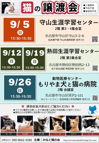 | イベント内容 | =みなと猫の会 第300回譲渡会のお知らせ== ◆ペットショップへ行く前にぜひ譲渡会へ◆ トイレトレーニングや 基本的な健康診断を終わらせた 猫たちが大集合! 子猫35~40匹、おとな猫4匹が参加予定です ○参加猫一覧 http://minatoneko2014.blog.fc2.com/blog-entry-1595.html ○主 催 みなと猫の会 ○日 時 9月26日(日) 13:30~15:30 ○場 所 動物医療センターもりやま犬と猫の病院 新館2F 会議室 名古屋市守山区深沢2-101 ゆとりーとライン 志段味西小学校バス停留所 徒歩2分 【会場Map】https://goo.gl/maps/oPzQu3PWqE32 ○車でお越しの場合は 病院第1~3駐車場をご利用ください ○お問い合わせは会場ではなく minatonekonokai@gmail.comもしくは 090-9662-3580 までお願いします ○参加猫について ・参加している猫は、ワクチンや駆虫等の基本治療を済ませています。 また、年齢に応じて避妊去勢手術を行っています。 ・参加予定猫が体調不良などで急遽不参加になることもあります。 ○ご来場の皆様へ ・譲渡会の見学は予約不要・入場無料です。 ・当日に猫をお渡しすることはありません。 後日ご自宅までお届けに伺います。 ・一週間から二週間のトライアル期間後、正式譲渡となります。 ・トライアル及び譲渡の際には 完全室内飼い・ご家族の同意・脱走防止策・ アンケート記入など諸条件がございます。 ・里親様には治療費の一部ご負担をお願いしております。 これ以上不幸な猫を増やさないための 治療費とさせて頂きますので何卒ご理解ください。 ・非会員の個人保護者も参加しています。 譲渡条件やトライアルは猫の保護者に準じます。 ・譲渡会の流れ http://minatoneko2014.blog.fc2.com/blog-entry-11.html ○参加猫情報は随時更新中! http://minatoneko2014.blog.fc2.com/blog-entry-493.html ○猫に関する相談も受け付けています ねこについての困りごと、トラブルなどを抱えている方、 相談へいらっしゃいませんか。 ○次回以降の譲渡会予定 日時:2021年10月3日(日)13:30-15:30 場所:港生涯学習センター 3階 視聴覚室 名古屋市港区港陽1-10-18 地下鉄名港線「港区役所」駅より徒歩9分 日時:2021年10月10日(日)13:30-15:30 場所:港生涯学習センター 3階 視聴覚室 名古屋市港区港陽1-10-18 地下鉄名港線「港区役所」駅より徒歩9分 日時:2021年10月17日(日)13:30-15:30 場所:港生涯学習センター 3階 視聴覚室 名古屋市港区港陽1-10-18 地下鉄名港線「港区役所」駅より徒歩9分 日時:2021年10月24日(日) 13:30-15:30 場所:動物医療センター もりやま犬と猫の病院 新館2階 会議室 愛知県名古屋市守山区深沢2-101 ゆとりーとライン「志段味西小学校」バス停留所 徒歩2分 日時:2021年10月31日(日) 13:30-15:30 場所:熱田生涯学習センター 2階 第3集会室 名古屋市熱田区熱田西町2-13 地下鉄名城線地下鉄「神宮西」駅より徒歩12分 ◎主催者ブログ みなと猫の会 ~こぴっと猫だより~ http://minatoneko2014.blog.fc2.com/ ■上記ブログに会ってみたい猫がいた!でも参加予定猫に入ってない、 どうすればいいの? ■譲渡会当日は都合が悪くて… それ以外の日に猫とお見合いがしたい! などのお問い合わせは minatonekonokai@gmail.com まで 〇感染症の拡大防止にご協力願います ※会場入出時の手指消毒にご協力ください ※定期的に換気作業を行います ※マスク等の装着をお願いいたします 写真1枚目 たぁ坊 ♂ 3ヵ月半 ちょっぴりビビりんちょですが 人のことは大好きです お膝の上もOK! 写真2枚目 秋彦(あきひこ)♂ 3ヵ月半 人見知りや場所見知りがありません 活動的で好奇心旺盛 素敵な鼻コアラ模様があります ☆★個性豊かな猫たちが皆様をお迎えします★☆ 猫とスタッフ一同、お待ちしております。 |