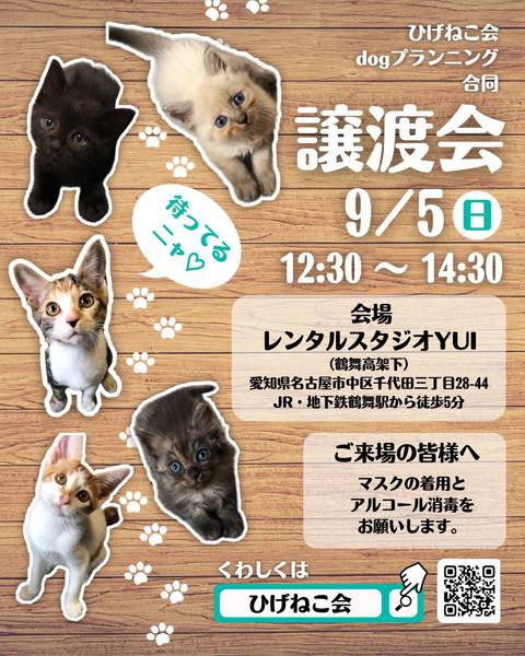 | イベント内容 | ひげねこ会・ドッグプランニング 合同で譲渡会を開催します。 2ヶ月弱からの子猫達が参加します ドッグプランニング☆インスタグラム https://www.instagram.com/yuko9124/ ひげねこ会HP https://sabuntama.wixsite.com/higenecokai ☆会場 愛知県 名古屋市中区千代田三丁目28-44 レンタルスタジオYUI(鶴舞高架下) ☆12:30~14:30 JR・地下鉄鶴舞駅から徒歩5分 ☆駐車場 鶴舞交差点~南のJR中央線ガード西側道路は休日駐車禁止解除になっています。 (休日駐禁解除区間に空きが無い場合は、コインパーキングをご利用ください。) 譲渡会についてのお願いです ※入場の際マスク着用・消毒をお願いします。 蜜を避けるため、入場制限をお願いする場合があります。 ご不便をおかけしますが、ご理解ご協力よろしくお願いします。 |