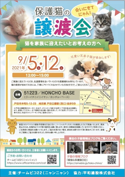 | イベント内容 | 【保護猫の譲渡会】 日時:9月5日(日曜日) 会場:51223/HONCHO BASE(ゴーイチニイニイサン/ホンチョーベース) 戸田市本町5-12-23 埼京線 戸田公園駅(西口)徒歩3分。 ※戸田公園駅西口ロータリーを出て、オリンピック通りの本町二丁目交差点を横断します。 直進し てください、立て看板のある細い道を左折して、すぐ右折してください。 お車の方は、付近のコイ ンパーキングをご使用ください。 【譲渡会に関してのお願い】 新型コロナウイルス感染予防策を万全に行い、ソーシャルディスタンスを確保したうえで実施いたしますので、以下、皆様のご理解とご協力を賜りますよう、何卒お願い申し上げます。 ・飛沫防止のため、会場内はマスク等の着用をお願い致します。 ・ご出発前に検温をお願いいたします。 ・会場にお入り頂く前に検温をお願い致します。 ・受付に消毒液を設置していますのでご利用くださ い。 ・ご来場者の人数によってはお待ち頂く事もあります。 ・ご協力を頂けない場合、参加をお断りさせて頂く場合がございます。 新型コロナウイルス感染予防策のため、人数制限しての開催ですので、ご見学のみ希望の方は見合わせていただけますようお願い致します。 参加する子猫の情報は、以下のブログをご覧ください。 https://ameblo.jp/toko-chino/ 皆様のご来場を心よりお待ちしております。 |