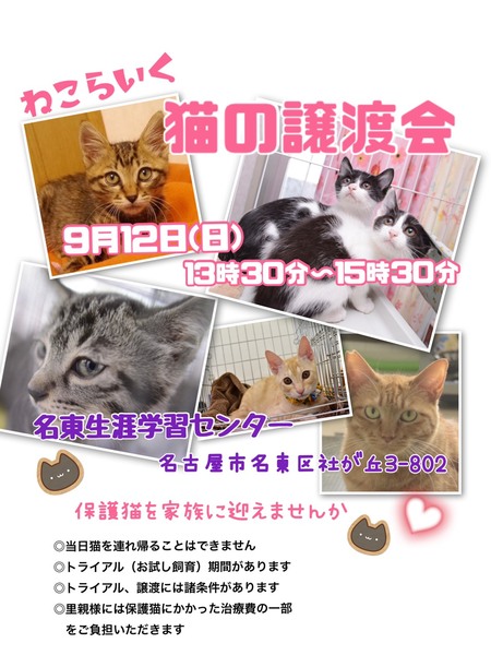 | イベント内容 | 「猫の譲渡会」 日にち:2021年9月12日(日) 時間 :午後1時30分~3時30分 会場 :名東生涯学習センター 2階 第1.2集会室 名古屋市名東区社が丘3-802 予約不要です *駐車場有(300円/日) 満車の場合は猪高緑地公園駐車場(無料)も ご利用になれます 生涯学習センターの受け付けに案内用地図が 用意されています 主催:ねこらいくnenet https://nekonetwork.com/ 募集猫中の猫は https://nekolike.amebaownd.com/ ―------- *子猫参加します 上記ブログで紹介しています 猫の急な体調変化により参加できない 場合もあります。 ご了承いただきますようお願いします。 実際に猫を見てから考えたい 飼育の仕方について質問したい・・・など すぐに決められない方でも結構です ぜひ、譲渡会におこしください 〇室内飼い、家族全員の同意、治療費の負担など お願いごとがあります 〇1~2週間のお試し飼育期間があります 〇当日、猫を連れて帰ることはできません *感染症対策を実施しています ・会場入出時の手の消毒、検温にご協力ください ・常時、窓を開け換気をしています ・スタッフはマスクを着用し、ご入場の方にもマ スクの着用をお願いしています ・室内への入場は一定の人数とさせていただきます |