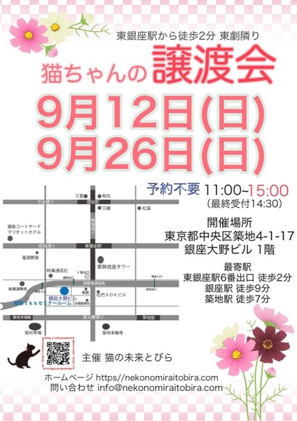 | イベント内容 | 東銀座で保護猫の譲渡会を開催しています「猫の未来とびら」です♪ 恵まれない環境にいる猫たちが未来へのとびらを開いて幸せなご縁に繋がる橋渡しをしていきます。 たくさんの猫ちゃんと保護主・スタッフ一同みなさまのご来場を心よりお待ちしています! 子猫ちゃん〜成猫ちゃんまで参加します♪ ※ご来場頂く方と私たち保護主、スタッフの安心と安全の為、感染リスクを限りなく低減させる為、私たちが出来うる対策をしてお待ちしております※ 【ご来場いただく皆様には下記についてお願い致します】 ★マスクの着用をお願い致します。 (マスク着用のない方は入場出来ません) ★譲渡会場にお入り頂く前に検温・手洗いと手の消毒、検温をお願い致します。 ★ソーシャル・ディスタンス(人と人との間隔を開ける)をお願い致します。 ★熱のある方や体調の優れない方は譲渡会への来場を見合わせて頂けますよう、お願い致します。 ★来場者数によりましては人数制限もありますので長時間お待たせてする場合もございます。 予めご了承下さい。 コロナウイルス感染拡大防止の為、厳しいお願いで大変恐縮ですが何卒ご理解とご協力、ご了承をいただけますようお願い致します。 ★☆★★☆★★☆★★☆★★☆★★☆★★☆★★☆★★☆★ ★開催日時 2021年9月12日(日) 11:00~15:00 (最終受付 14:30) ★子猫希望者多数の場合、11時00分より整理券を配布致します。 ★会場 東京都中央区築地4-1-17 銀座大野ビル 1階 (東劇となり) ★最寄駅 東銀座駅 6番出口 徒歩2分 銀座駅 徒歩9分 ・築地駅 徒歩7分 駐車場は当ビルの駐車場または近隣のコインパーキング等をご利用ください。 会場への直接のお問い合わせはご遠慮くださいませ。 ★☆★★☆★★☆★★☆★★☆★★☆★★☆★★☆★★☆★ コロナ禍のため、猫ちゃんとの触れあいはご遠慮頂いております。 里親様・猫ちゃんが双方、幸せな家族になれるよう保護主・スタッフがサポート致します。 ご不安な事はお気軽にご相談ください。 入場無料です。事前のご予約は不要です。 当日猫ちゃんの引き渡しはございません。 後日、保護主が里親様宅へお届けいたします。 ※参加予定猫ちゃんは、急な体調不良等で不参加になる場合もございます。 開催当日の朝、当会ブログにて不参加の最新情報を掲載致しますのでご確認をお願い申し上げます。 ◇譲渡に関してのお願い・基本条件 1.家族の一員として終生最期まで愛育下さい。 2.完全室内飼い・ペット可のお住まい 3.脱走防止対策 4.避妊・去勢手術 5.里親様のご自宅へのお届け 6.譲渡誓約書への署名捺印・身分証明書の提示 7.医療費譲渡金のご負担 8.定期報告 9.トライアル期間有り ※保護主により譲渡条件は異なりますので会場で直接ご相談ください。 60才以上の方のみのご家庭、未成年の方、単身の方、同棲中の方、 小学生低学年以下のお子様のいる方、必要な脱走対策を施していただけない方は譲渡が出来かねますのでご了承ください。 仔猫の場合は主にお世話される方のご年齢は55歳までとさせて頂きます。 オーバーする方はご相談くださいませ。 小さな子猫の譲渡は体重が1kgになってからのお届けやお留守番の無い(少ない)ご家庭を希望いたします。 動物も病気になったり、年老いた場合には介護が必要になる場合がございますので、その時にきちんと必要な医療費を捻出出来る、経済力がある里親さまへの譲渡となります。 医療費譲渡金に関しましては詳しくはホームページの 【譲渡に関してのお願い】【譲渡の流れ】をご覧くださいませ。 ~主催 猫の未来とびら~ |