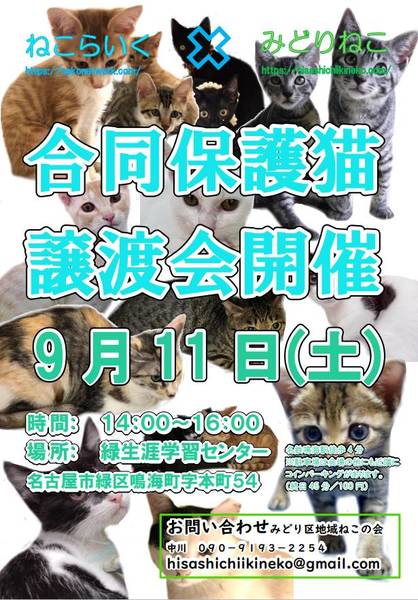 | イベント内容 | 名古屋市緑区生涯学習センターにて開催いたします。 今回は2部屋借りてねこらいくさんとの合同譲渡会です。 詳細は 09091932254 中川までお問い合わせ下さい。 |
