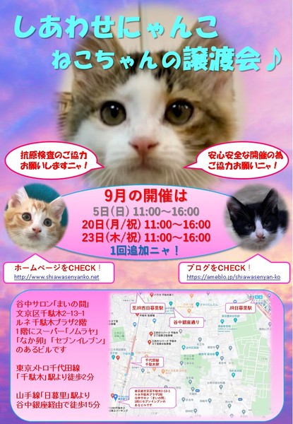 | イベント内容 | 「しあわせにゃんこ」は行き場のない猫ちゃんと里親様との出会いの場を提供するグループです♪ 子猫も成猫もハンデのある猫もみんな新しい家族を待っています♪ みなさまのご来場を保護主、スタッフ一同心よりお待ちしております♪ 第5波対策として会場での抗原検査のご協力をお願いしております。 お手数ですが詳細はホームページやブログをご確認願います。 安心安全な開催継続の為、皆様のご協力お願い致します。 開催にあたりソーシャルディスタンスを守る為、各種制限等を設けております。 ※詳しくはホームページ譲渡会情報をご確認願います。 http://www.shiawasenyanko.net/jyoutokai.html ◆開催日/開催時間◆ 2021年9月23日(木/祝) 11:00~16:00 ※今回は日曜日ではなく祝日(秋分の日)開催となりますのでご注意下さい! ご希望の猫ちゃんがいらっしゃる場合は11時30分までに受付をお願い致します。 複数のお申し込みがある場合は11時30分で受付を終了させて頂く場合がございます。 受付をされた全ての里親様とお見合いをさせて頂きます。 ※先着順ではございません。 ※当日、猫ちゃんを連れて帰ることは出来ません。 後日調整のうえ保護主が里親様宅へお届けいたします。 ◆会場◆ 東京都文京区千駄木2-13-1 ルネ千駄木プラザ2階 谷中サロン「まいの間」 ※詳しいアクセスはホームページ案内図をご覧下さい http://www.shiawasenyanko.net/mapmainoma.pdf 谷中サロン「まいの間」の情報はこちら http://neko-to-kyo.com/#maima ◆交通手段◆ 東京メトロ千代田線「千駄木」駅より徒歩2分 JR山手線「西日暮里」駅より徒歩12分 JR山手線「日暮里」駅より谷中銀座経由で徒歩15分 ※お車でご来場の際、駐車場のご用意はございません。 近隣のコインパーキング等をご利用ください。※近隣に沢山あります。 いつ里の掲載参加猫一覧はこちらから https://satoya-boshu.net/mypage/foster_list.php?@ps@=none アメーバブログの里親募集にゃんこはこちら https://ameblo.jp/shiawasenyan-ko/theme-10092719565.html ◆猫ちゃんとのお見合い◆ 掲載している猫ちゃんは基本的に譲渡会場でのお見合いのみとなります。 譲渡会への参加が決定している猫ちゃんはその譲渡会で里親様が決定しなかった場合のみ保護主宅でのお見合いが可能となります。 自宅お見合いを希望される里親様はメール(info@shiawasenyanko.net)にてご相談ください。 ◆当譲渡会では猫ちゃんと里親様のスキンシップを大切にしています◆ 新しい家族として20年以上いっしょに暮らしていく猫ちゃんです。 譲渡会場でたくさんの猫ちゃんと触れ合って良きパートナーを見つけてください。 はじめて猫ちゃんを迎える不安や先住猫ちゃんとのトライアルの注意点、猫ちゃんと里親様の暮らし方など気軽にご相談ください。 経験豊富な保護主や猫大好きスタッフがアドバイスさせていただきます。 ◆子猫ご希望の里親様◆ 子猫は急な下痢や発熱等により体調が急変し、数時間対応ができなかっただけでも命を落とす事があります。 その為、当譲渡会では月齢によりお留守番のない又は少ないご家庭への譲渡に限らせて頂いております。 また里親様と子猫ちゃんが安心してトライアル期間を過ごせるよう体重が1㎏程になってからのお届けとさせて頂いております。 ◆里親希望のみなさまへ◆ ご家族の皆様で生涯、家族の一員としてたっぷり愛情を注いでくださるご家庭をお待ちしております。 下記に該当する希望者様へ ・独身、単身者の方 ・友人同士、同棲でのお住まいの方 ・高齢者のみのご家庭の方 は、ご相談の上、譲渡を判断させて頂きます ・適正飼育の不可能な方 ・脱走防止対策にご協力頂けない方 ・定期報告の不可能な方 は、ご遠慮下さいますようお願い致します ◆ご負担頂く費用について◆ 譲渡の際に譲渡負担金(医療費の一部、譲渡金、お届け時の交通費)を里親様にご負担頂く事により 過酷な状況にいる猫ちゃんを保護し新しいご家族の元へ送り出す事ができています。 皆様のご理解とご協力にボランティア一同、心より感謝しております。 ご負担頂く医療費につきましてはホームページに詳しく記載させて頂いております。 http://www.shiawasenyanko.net/onegai.html しあわせにゃんこホームページ http://www.shiawasenyanko.net メールでのお問い合わせ info@shiawasenyanko.net |