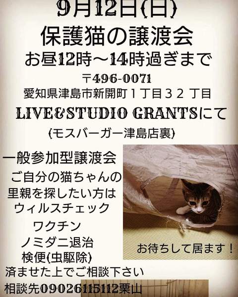 | イベント内容 | いつものGRANTSです❗譲渡会のお手伝い、猫達のお世話、捕獲のお手伝い、預かりボランティアさん、ミルクボランティアさん、病院などの送迎をしてくれるボランティアさん、居てくれたら、とても、助かります✨ 一般市民参加型譲渡会です!お問い合わせ下さい✨ |