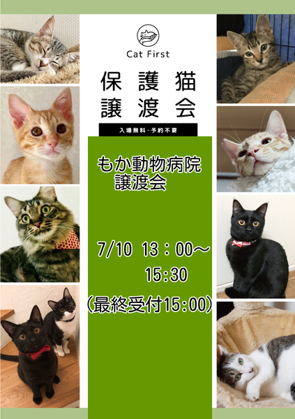 | イベント内容 | 〈皆さまへのお願い〉 ※コロナウィルス感染拡大防止の為、当日はマスク着用でお越し下さい。 ※また消毒、検温のご協力お願い致します。 ※換気の為に会場の窓、入り口ドアを開放します。 その為猫の脱走防止対策として抱っこ、ケージのドアを開けての触れ合いは 原則禁止とします。 ※面談の際、スタッフはフェイスシールド着用させて頂きます。 ※状況によりましては入場制限、時間制限を設ける場合がございます。 時間に余裕を持ってお越し下さい。 皆様にはご迷惑おかけ致しますが 何卒、ご理解ご協力のほど宜しくお願い致します。 ⚫︎入場料は無料です。 ⚫︎近隣にはコインパーキングもございます。 ⚫︎もか動物病院へのお問い合わせはご遠慮願います。 ⚫︎当日、猫は連れて帰れません。 ⚫︎里親会開催までに里親様が決まったり、 体調不良等の理由で当日参加できない場合がございます。 お問合せ先 catfirstsatooyakai@yahoo.co.jp ブ ロ グ http://catfirst.blog.fc2.com |