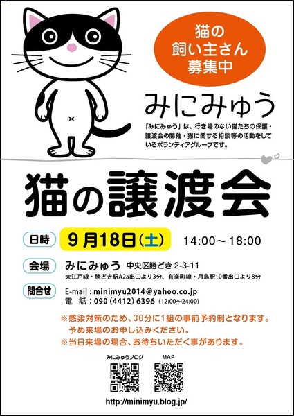 | イベント内容 | みにみゅう 猫の譲渡会 9月18日(土) 14時〜18時 30分ごとの予約制になります。 当日来場も可能ですが、予約の方が優先で、密にならないよう お待ちいただく事があります。 予約は、こちらから 電話 090 4412 6396 メール mini myu2014@yahoo.co.jp 参加猫については ブログ http://minimyu.blog.jp |