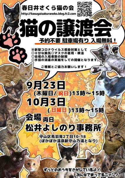 | イベント内容 | 30匹前後の猫ちゃん達が参加します! ラブリー、チャーミング、フレンドリー、ジェントル&ワイルド系まで、個性豊かな面々が新しい家族との出会いを待っていますよ。 本気モードの里親さん、是非お越しください。 |