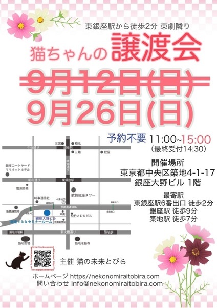 | イベント内容 | 東銀座で保護猫の譲渡会を開催しています「猫の未来とびら」です♪ 恵まれない環境にいる猫たちが未来へのとびらを開いて幸せなご縁に繋がる橋渡しをしていきます。 たくさんの猫ちゃんと保護主・スタッフ一同みなさまのご来場を心よりお待ちしています! 子猫ちゃん〜成猫ちゃんまで参加します♪ ※ご来場頂く方と私たち保護主、スタッフの安心と安全の為、感染リスクを限りなく低減させる為、私たちが出来うる対策をしてお待ちしております※ 【ご来場いただく皆様には下記についてお願い致します】 ★不織布マスクの着用をお願い致します。 (マスク着用のない方は入場出来ません) ★譲渡会場にお入り頂く前に検温・手洗いと手の消毒、検温をお願い致します。 ★ソーシャル・ディスタンス(人と人との間隔を開ける)をお願い致します。 ★熱のある方や体調の優れない方は譲渡会への来場を見合わせて頂けますよう、お願い致します。 ★来場者数によりましては人数制限もありますので長時間お待たせてする場合もございます。 予めご了承下さい。 コロナウイルス感染拡大防止の為、厳しいお願いで大変恐縮ですが何卒ご理解とご協力、ご了承をいただけますようお願い致します。 ★☆★★☆★★☆★★☆★★☆★★☆★★☆★★☆★★☆★ ★開催日時 2021年9月26日(日) 11:00~15:00 (最終受付 14:30) ★子猫希望者多数の場合、11時00分より整理券を配布致します。 ★会場 東京都中央区築地4-1-17 銀座大野ビル 1階 (東劇となり) ★最寄駅 東銀座駅 6番出口 徒歩2分 銀座駅 徒歩9分 ・築地駅 徒歩7分 駐車場は当ビルの駐車場または近隣のコインパーキング等をご利用ください。 会場への直接のお問い合わせはご遠慮くださいませ。 ★☆★★☆★★☆★★☆★★☆★★☆★★☆★★☆★★☆★ コロナ禍のため、猫ちゃんとの触れあいはご遠慮頂いております。 里親様・猫ちゃんが双方、幸せな家族になれるよう保護主・スタッフがサポート致します。 ご不安な事はお気軽にご相談ください。 入場無料です。事前のご予約は不要です。 当日猫ちゃんの引き渡しはございません。 後日、保護主が里親様宅へお届けいたします。 ※参加予定猫ちゃんは、急な体調不良等で不参加になる場合もございます。 開催当日の朝、当会ブログにて不参加の最新情報を掲載致しますのでご確認をお願い申し上げます。 ◇譲渡に関してのお願い・基本条件 1.家族の一員として終生最期まで愛育下さい。 2.完全室内飼い・ペット可のお住まい 3.脱走防止対策 4.避妊・去勢手術 5.里親様のご自宅へのお届け 6.譲渡誓約書への署名捺印・身分証明書の提示 7.医療費譲渡金のご負担 8.定期報告 9.トライアル期間有り ※保護主により譲渡条件は異なりますので会場で直接ご相談ください。 60才以上の方のみのご家庭、未成年の方、単身の方、同棲中の方、 小学生低学年以下のお子様のいる方、必要な脱走対策を施していただけない方は譲渡が出来かねますのでご了承ください。 仔猫の場合は主にお世話される方のご年齢は55歳までとさせて頂きます。 オーバーする方はご相談くださいませ。 小さな子猫の譲渡は体重が1kgになってからのお届けやお留守番の無い(少ない)ご家庭を希望いたします。 動物も病気になったり、年老いた場合には介護が必要になる場合がございますので、その時にきちんと必要な医療費を捻出出来る、経済力がある里親さまへの譲渡となります。 医療費譲渡金に関しましては詳しくはホームページの 【譲渡に関してのお願い】【譲渡の流れ】をご覧くださいませ。 ~主催 猫の未来とびら~ |