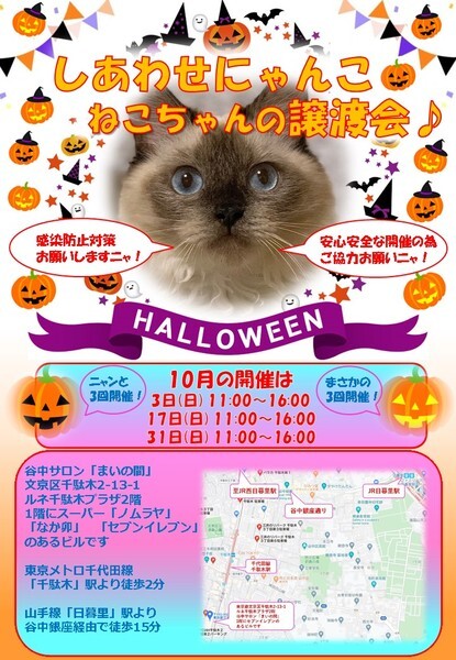 | イベント内容 | 「しあわせにゃんこ」は行き場のない猫ちゃんと里親様との出会いの場を提供するグループです♪ 子猫も成猫もハンデのある猫もみんな新しい家族を待っています♪ みなさまのご来場を保護主、スタッフ一同心よりお待ちしております♪ 開催にあたりソーシャルディスタンスを守る為、各種制限等を設けております。 ※詳しくはホームページ譲渡会情報をご確認願います。 http://www.shiawasenyanko.net/jyoutokai.html ◆開催日/開催時間◆ 2021年10月31(日) 11:00~16:00 ※隔週開催の関係で10月はナント3回開催です! しかもハロウィーン開催です♪ ご希望の猫ちゃんがいらっしゃる場合は11時30分までに受付をお願い致します。 複数のお申し込みがある場合は11時30分で受付を終了させて頂く場合がございます。 受付をされた全ての里親様とお見合いをさせて頂きます。 ※先着順ではございません。 ※当日、猫ちゃんを連れて帰ることは出来ません。 後日調整のうえ保護主が里親様宅へお届けいたします。 ◆会場◆ 東京都文京区千駄木2-13-1 ルネ千駄木プラザ2階 谷中サロン「まいの間」 ※詳しいアクセスはホームページ案内図をご覧下さい http://www.shiawasenyanko.net/mapmainoma.pdf 谷中サロン「まいの間」の情報はこちら http://neko-to-kyo.com/#maima ◆交通手段◆ 東京メトロ千代田線「千駄木」駅より徒歩2分 JR山手線「西日暮里」駅より徒歩12分 JR山手線「日暮里」駅より谷中銀座経由で徒歩15分 ※お車でご来場の際、駐車場のご用意はございません。 近隣のコインパーキング等をご利用ください。※近隣に沢山あります。 いつ里の掲載参加猫一覧はこちらから https://satoya-boshu.net/mypage/foster_list.php?@ps@=none アメーバブログの里親募集にゃんこはこちら https://ameblo.jp/shiawasenyan-ko/theme-10092719565.html ◆猫ちゃんとのお見合い◆ 掲載している猫ちゃんは基本的に譲渡会場でのお見合いのみとなります。 譲渡会への参加が決定している猫ちゃんはその譲渡会で里親様が決定しなかった場合のみ保護主宅でのお見合いが可能となります。 自宅お見合いを希望される里親様はメール(info@shiawasenyanko.net)にてご相談ください。 ◆当譲渡会では猫ちゃんと里親様のスキンシップを大切にしています◆ 新しい家族として20年以上いっしょに暮らしていく猫ちゃんです。 譲渡会場でたくさんの猫ちゃんと触れ合って良きパートナーを見つけてください。 はじめて猫ちゃんを迎える不安や先住猫ちゃんとのトライアルの注意点、猫ちゃんと里親様の暮らし方など気軽にご相談ください。 経験豊富な保護主や猫大好きスタッフがアドバイスさせていただきます。 ◆子猫ご希望の里親様◆ 子猫は急な下痢や発熱等により体調が急変し、数時間対応ができなかっただけでも命を落とす事があります。 その為、当譲渡会では月齢によりお留守番のない又は少ないご家庭への譲渡に限らせて頂いております。 また里親様と子猫ちゃんが安心してトライアル期間を過ごせるよう体重が1㎏程になってからのお届けとさせて頂いております。 ◆里親希望のみなさまへ◆ ご家族の皆様で生涯、家族の一員としてたっぷり愛情を注いでくださるご家庭をお待ちしております。 下記に該当する希望者様へ ・独身、単身者の方 ・友人同士、同棲でのお住まいの方 ・高齢者のみのご家庭の方 は、ご相談の上、譲渡を判断させて頂きます ・適正飼育の不可能な方 ・脱走防止対策を考えて頂けない方 ・定期報告の不可能な方 は、ご遠慮下さいますようお願い致します ◆ご負担頂く費用について◆ 譲渡の際に譲渡負担金(医療費の一部、譲渡金、お届け時の交通費)を里親様にご負担頂く事により 過酷な状況にいる猫ちゃんを保護し新しいご家族の元へ送り出す事ができています。 皆様のご理解とご協力にボランティア一同、心より感謝しております。 ご負担頂く医療費につきましてはホームページに詳しく記載させて頂いております。 http://www.shiawasenyanko.net/onegai.html しあわせにゃんこホームページ http://www.shiawasenyanko.net メールでのお問い合わせ info@shiawasenyanko.net |