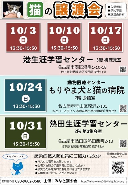 | イベント内容 | =みなと猫の会 第305回譲渡会のお知らせ== シッポのある家族を譲渡会から迎えませんか ◆ペットショップへ行く前にぜひ譲渡会へ◆ トイレトレーニングや 基本的な健康診断を終わらせた 猫たちが大集合! 子猫30匹おとな猫4匹が参加予定です ○参加猫一覧 http://minatoneko2014.blog.fc2.com/blog-entry-1602.html ○主 催 みなと猫の会 ○日 時 2021年10月31日(日) 13:30~15:30 ○場 所 熱田生涯学習センター 第3集会室 愛知県名古屋市熱田区熱田西町2-13 地下鉄名城線「神宮西」駅 徒歩12分 ※駐車場有(専用16台 外部30台 いずれも利用料:300円/日) ↓外部コインパーキング(タイムス白鳥公園) https://goo.gl/maps/be4DBuaCwnEY8z6P9 ※お問い合わせは会場ではなく minatonekonokai@gmail.comもしくは 090-9662-3580 まで ○参加猫について ・参加している猫は、ワクチンや駆虫等の基本治療を済ませています。 また、年齢に応じて避妊去勢手術を行っています。 ・参加予定猫が体調不良などで急遽不参加になることもあります。 ○ご来場の皆様へ ・譲渡会の見学は入場無料・予約不要です。 ・当日に猫をお渡しすることはありません。 後日ご自宅までお届けに伺います。 ・一週間から二週間のトライアル期間後、正式譲渡となります。 ・トライアル及び譲渡の際には 完全室内飼い・ご家族の同意・脱走防止策・ アンケート記入など諸条件がございます。 ・里親様には治療費の一部ご負担をお願いしております。 これ以上不幸な猫を増やさないための 治療費とさせて頂きますので何卒ご理解ください。 ・非会員の個人保護者も参加しています。 譲渡条件やトライアルは猫の保護者に準じます。 ・譲渡会の流れ http://minatoneko2014.blog.fc2.com/blog-entry-11.html ○参加猫情報は随時更新中! http://minatoneko2014.blog.fc2.com/blog-entry-493.html ○猫に関する相談も受け付けています ねこについての困りごと、トラブルなどを抱えている方、 相談へいらっしゃいませんか。 ○次回以降の譲渡会予定 日時:2021年11月7日(日)13:30-15:30 場所:港生涯学習センター 3階 視聴覚室 名古屋市港区港陽1-10-18 地下鉄名港線「港区役所」駅より徒歩9分 日時:2021年11月14日(日) 13:30-15:30 場所:熱田生涯学習センター 2階 第3集会室 名古屋市熱田区熱田西町2-13 地下鉄名城線地下鉄「神宮西」駅より徒歩15分 日時:2021年11月21日(日)13:30-15:30 場所:港生涯学習センター 3階 視聴覚室 名古屋市港区港陽1-10-18 地下鉄名港線「港区役所」駅より徒歩9分 日時:2021年11月28日(日) 13:30-15:30 場所:動物医療センター もりやま犬と猫の病院 新館2階 会議室 愛知県名古屋市守山区深沢2-101 ゆとりーとライン「志段味西小学校」バス停留所 徒歩2分 ◎主催者ブログ みなと猫の会 ~こぴっと猫だより~ http://minatoneko2014.blog.fc2.com/ ■上記ブログに会ってみたい猫がいた!でも参加予定猫に入ってない、 どうすればいいの? ■譲渡会当日は都合が悪くて… それ以外の日に猫とお見合いがしたい! などのお問い合わせは minatonekonokai@gmail.com まで 〇感染症の拡大防止にご協力願います ※会場入出時の手の消毒にご協力ください ※定期的に換気作業を行います ※マスク等の装着を推奨しております 写真3枚目 みやるん ♂ 4~5ヶ月 控えめで温厚な男の子 マイペースです ☆★個性豊かな猫たちが皆様をお迎えします★☆ 猫とスタッフ一同、お待ちしております |