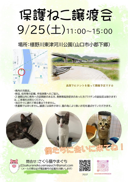 | イベント内容 | ⭐️保護ねこ譲渡会⭐️9月25日土曜日11時〜15時⭐️山口市小郡下郷 椹野川東津河川公園(高架下にテントを張って開催予定) TNRの現場で保護した仔猫達が多数参加します。可愛い仔猫達に会いに来てくださいね。 ⭐️現在の状況を鑑み、ご来場は県内の方限定とさせて頂きます。検温、手指消毒、連絡先の記入にご協力お願い致します。譲渡には条件があります。当日すぐに連れて帰ることは出来ません。 詳しくは『さくら猫やまぐち』のブログをご覧ください。 https://blog.canpan.info/sakuranekoyamaguchi/ |