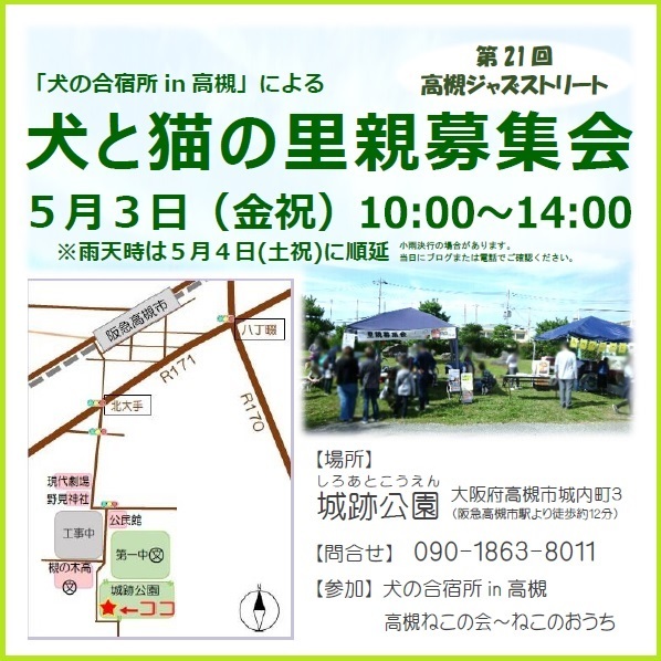 | イベント内容 | ※雨天時は5月4日(土祝)に延期。 小雨決行の時があります。当日にブログまたは電話でご確認ください。 「高槻ジャズストリート」という大きなイベントの一角で行います。 近隣のコインパーキングは混雑が予想されます。 公共交通機関のご利用を強くお勧めします。 ※ ねこは「高槻ねこの会~ねこのおうち」さんが参加されます。 http://neconoouchi.seesaa.net/ ※ 参加犬については、ブログ「犬の合宿所」での直前チェックをお願いします。 http://inunogassyukusyo.seesaa.net/ ■お問合せ⇒090-1863-8011 または「犬の合宿所」ブログのコメントから。 ********** 市民ボランティア「犬の合宿所in高槻」は、 殺処分数の多い地方の保健所収容犬を引き取り、関西で新しい飼い主探しをしています。 保護犬を飼うことが文化として定着することで生体販売に伴う悲惨な繁殖犬の存在がなくなることと、 地方の収容犬を人口の多い地域で引き受けることで全体として処分数が減ることを目指しています。 毎月の里親募集会には、いつも10頭程度が全員集合して、本当の家族との出会いを待ちます。 里親会には何度でも参加して、これぞ!という巡り合いをゲットして下さいね! ★ 一時預かりさんや 犬の搬送ボランティアさんを、常時募集しています。 ★犬の合宿所でのミニミニお見合い会は、お見合い希望の方が複数名あれば随時開催できる場合がありますから、Telまたはブログコメント(要メールアドレス明記)でのお申込み、チェックをお願いします。 ■保護犬や譲渡会についての最新情報はブログでお伝えしています。 http://inunogassyukusyo.seesaa.net/ 電話 090-1863-8011 |