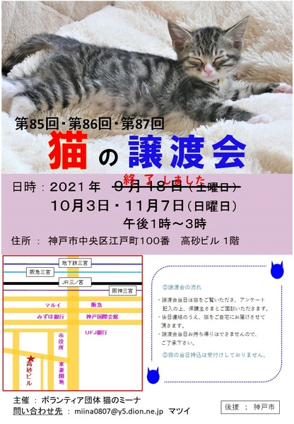 | イベント内容 | 今年生まれの仔猫や大人猫も参加して、新しいお家を求めて参加します(=^・^=) 猫は後日こちらからお届けをさせて頂き、お家の環境を見せて頂ければと思います。 猫は20年くらい生きる子もいますので、ご自身の年齢に合った猫さんとの出会いを探しに来てください。 ペット不可にお住まいの方はご遠慮ください! 仔猫の場合は、お留守番が長いお家には難しいですので、ご了承ください。 譲渡には条件が多数ありますので、ご理解くださいませ<m(__)m>。 お越しの際は各駅の三宮からは徒歩10分ほどです。 車でお越しの場合は、近隣にはコインパーキングがあります。 当日、体調の悪い方、発熱がある方、このような方はご遠慮ください。 こちらでは、体温チェックや消毒をし、万全を期しております。 |