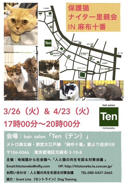 | イベント内容 | FIPフリー:全頭FIP血液検査を実施。陽性の子と陰性の子は隔離、猫たちは最高の環境の中にいます。 コロナウィルス抗体価100未満陰性の子のみ里親会に参加。 また、お問い合せの前にお願い事項の確認をお願いします。 http://homepage2.nifty.com/hitotoneko/keiyaku.html 4箇月齢以下の子猫は、 2頭一組または同世代の先住子猫がいる方、 お留守番時間が8時間以下の方 に限ってお譲りします。 成猫については、お留守番時間についての制限は特にございません。 猫又は犬を4頭以上飼っている方にはお譲りできません。 55歳以上の方には、子猫はお譲り出来ません。 60歳の方は5歳、65歳の方なら10歳の成猫ならお譲りできます。 お試し期間は1週間です。 お申し込み時に、運転免許証、健康保険証など、 身分を保証する証明証の提示をお願いします。 猫が欲しい。猫を飼ってみたい。 猫に不妊・去勢手術を受けさせたい。 猫のボランティアをやってみたい その他、猫の相談よろず引き受けます。 一緒にボランティアをやってみませんか。会員募集中! 港区、新宿区のシェルターの猫のお世話係 週1回、2時間程度、時間帯は自由 学生には交通費として1000円を一律に支給します。 他に、TNRボランティア、搬送ボランティアなどを募集しています。 まずはお気軽に体験作業にお越し下さい。 主催 地域猫から社会猫へ・猫の生きる権利確認連絡協議会 電話 080-5437-2665 メールアドレス hitotoneko@ezweb.ne.jp ホームページ http://hitotoneko.la.coocan.jp |