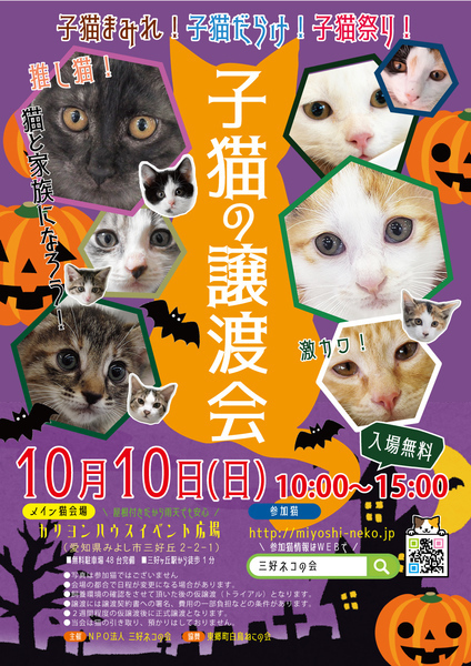 | イベント内容 | まだまだ子猫いっぱい、15匹の子猫が参加! 秋はほのぼの猫生活、猫のいる暮らしを始めませんか? ネコと家族になると幸せを感じますよ。 http://miyoshineko.sblo.jp/article/189041763.html ★★子猫15匹!子猫15匹!子猫15匹!★★ 10月10日(日)10時~15時 愛知県みよし市三好丘2-2-1 三好ヶ丘カリヨンハウスイベント広場(屋内会場) <来場前にご確認ください> 会場前で整理券をお渡し後、順番にご案内いたします。 入場をグループ制とさせていただき、各グループ10人程度、会場内の滞在時間を30分程度に制限しています。 必ず来場者全員が入場できるように調整します。 猫は早いもの勝ちではございません。 (=^・^=)三毛ママおたすけ募金(=^・^=) 引き続きあたたかいご支援宜しくお願いします。 http://miyoshi-neko.jp/mam_pc.html 主催:NPO法人三好ネコの会 http://miyoshi-neko.jp |