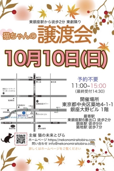 | イベント内容 | 東銀座で保護猫の譲渡会を開催しています「猫の未来とびら」です♪ 恵まれない環境にいる猫たちが未来へのとびらを開いて幸せなご縁に繋がる橋渡しをしていきます。 たくさんの猫ちゃんと保護主・スタッフ一同みなさまのご来場を心よりお待ちしています! 子猫ちゃん〜成猫ちゃんまで参加します♪ ※ご来場頂く方と私たち保護主、スタッフの安心と安全の為、感染リスクを限りなく低減させる為、私たちが出来うる対策をしてお待ちしております※ 【ご来場いただく皆様には下記についてお願い致します】 ★不織布マスクの着用をお願い致します。 (マスク着用のない方は入場出来ません) ★譲渡会場にお入り頂く前に検温・手洗いと手の消毒、検温をお願い致します。 ★ソーシャル・ディスタンス(人と人との間隔を開ける)をお願い致します。 ★熱のある方や体調の優れない方は譲渡会への来場を見合わせて頂けますよう、お願い致します。 ★来場者数によりましては人数制限もありますので長時間お待たせてする場合もございます。 予めご了承下さい。 コロナウイルス感染拡大防止の為、厳しいお願いで大変恐縮ですが何卒ご理解とご協力、ご了承をいただけますようお願い致します。 ★☆★★☆★★☆★★☆★★☆★★☆★★☆★★☆★★☆★ ★開催日時 2021年10月10日(日) 11:00~15:00 (最終受付 14:30) ★子猫希望者多数の場合、11時00分より整理券を配布致します。 ★会場 東京都中央区築地4-1-17 銀座大野ビル 1階 (東劇となり) ★最寄駅 東銀座駅 6番出口 徒歩2分 銀座駅 徒歩9分 ・築地駅 徒歩7分 駐車場は当ビルの駐車場または近隣のコインパーキング等をご利用ください。 会場への直接のお問い合わせはご遠慮くださいませ。 ★☆★★☆★★☆★★☆★★☆★★☆★★☆★★☆★★☆★ コロナ禍のため、猫ちゃんとの触れあいはご遠慮頂いております。 里親様・猫ちゃんが双方、幸せな家族になれるよう保護主・スタッフがサポート致します。 ご不安な事はお気軽にご相談ください。 入場無料です。事前のご予約は不要です。 当日猫ちゃんの引き渡しはございません。 後日、保護主が里親様宅へお届けいたします。 ※参加予定猫ちゃんは、急な体調不良等で不参加になる場合もございます。 開催当日の朝、当会ブログにて不参加の最新情報を掲載致しますのでご確認をお願い申し上げます。 ◇譲渡に関してのお願い・基本条件 1.家族の一員として終生最期まで愛育下さい。 2.完全室内飼い・ペット可のお住まい 3.脱走防止対策 4.避妊・去勢手術 5.里親様のご自宅へのお届け 6.譲渡誓約書への署名捺印・身分証明書の提示 7.医療費譲渡金のご負担 8.定期報告 9.トライアル期間有り ※保護主により譲渡条件は異なりますので会場で直接ご相談ください。 60才以上の方のみのご家庭、未成年の方、単身の方、同棲中の方、 小学生低学年以下のお子様のいる方、必要な脱走対策を施していただけない方は譲渡が出来かねますのでご了承ください。 仔猫の場合は主にお世話される方のご年齢は55歳までとさせて頂きます。 オーバーする方はご相談くださいませ。 小さな子猫の譲渡は体重が1kgになってからのお届けやお留守番の無い(少ない)ご家庭を希望いたします。 動物も病気になったり、年老いた場合には介護が必要になる場合がございますので、その時にきちんと必要な医療費を捻出出来る、経済力がある里親さまへの譲渡となります。 医療費譲渡金に関しましては詳しくはホームページの 【譲渡に関してのお願い】【譲渡の流れ】をご覧くださいませ。 ~主催 猫の未来とびら~ |