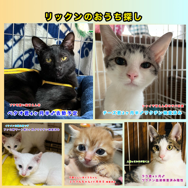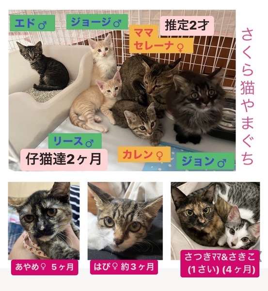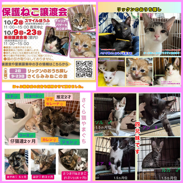 | イベント内容 | 防府市の『スマイルほうふ』で「保護ねこ譲渡会」が開催されます。 時間は11時から15時まで。 TNRの現場で保護した子猫達などが里親さんを待っています。 猫ちゃん達は写真で見るより実際に見てもらった方が可愛いと思います。 ぜひ足をお運びいただいて、運命の子との出会いを見つけてください。 *譲渡には条件がありますので、気になる子がいましたらお問い合わせください。 *参加予定ねこちゃんは当日変更になる場合があります。 *チャリティーバザーもあります。 *感染症予防対策は会場でも行っておりますが、各自でも宜しくお願い致します。 *画像はほっぷさん作成のものを使用させて頂いております。 *入場の際はマスク着用の上、検温や手指消毒にご協力お願い致します。 *台風や大雨、新型コロナウイルス感染拡大状況によっては急きょ中止になる場合もあります |