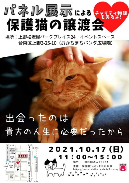 | イベント内容 | 上野でパネル展示式による保護猫の譲渡会を開催いたします! パネル展示式ですが、実際に保護猫にお会いしたい場合、その場でお見合いのお申込みもできます。 ※当日のお見合いはできません。お申込み後こちらで調整し、後日お見合い日をご連絡させて頂きます。 これから猫のお迎えを考えている方、この機会に保護猫のお迎えを考えてみてくださいませんか? 当日はチャリティグッズも販売いたします。 売り上げは全額保護猫のために使用させて頂いております。 チャリティグッズも、是非ご覧ください。 |