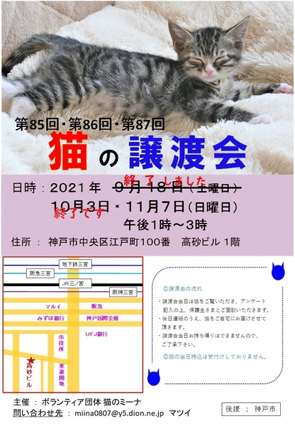 | イベント内容 | 保護された大人猫や子猫たちが参加して、新しいお家を求めて参加します(=^・^=) 猫は後日こちらからお届けをさせて頂き、お家の環境を見せて頂ければと思います。 猫は20年くらい生きる子もいますので、ご自身の年齢に合った猫さんとの出会いを探しに来てください。 ペット不可にお住まいの方はご遠慮ください! 仔猫の場合は、お留守番が長いお家には難しいですので、ご了承ください。 譲渡には条件が多数ありますので、ご理解くださいませ<m(__)m>。 予約制になっておりますので、里親希望の方は『 猫のミーナ 』のお問い合わせからご連絡をして、時間を決めて頂ければと思います。 お越しの際は各路線三宮駅からは徒歩10分くらい、車でお越しの場合は近隣にコインパーキングがありますので、そちらをご利用いただければと思います。 当日、体調の悪い方、発熱がある方、このような方はご遠慮ください。 こちらでは、体温チェックや消毒をし、万全を期しております。 |