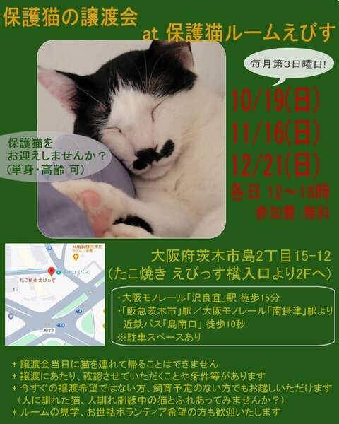 イベント内容 | 毎月第3日曜日、ずっとのお家を待つ子たちの譲渡会です! 1歳未満の仔猫も参加します。 募集ページの他、Instagram/X/Threadsに現在ルームにいる子たちの最新情報を掲載しています。 (不定期ですが、アメブロにてSNS投稿のまとめページを作成中です) 募集ページ未掲載の子たちにも会っていただけます。 譲渡希望や飼養予定がなくとも、「猫たちに会いたい!」「保護猫ボランティアをしてみたい!」という方も大歓迎です。 猫たちの人馴れ訓練にもなりますので、どうぞ気軽にお越しください。 ※参加予定の猫は体調により参加できない場合があります。予めご了承ください ※当日猫を連れて帰るこ事はできません ※複数台分の駐車場がありますが、満車の際は少しお待ちいただくなどご協力をお願いいたします |