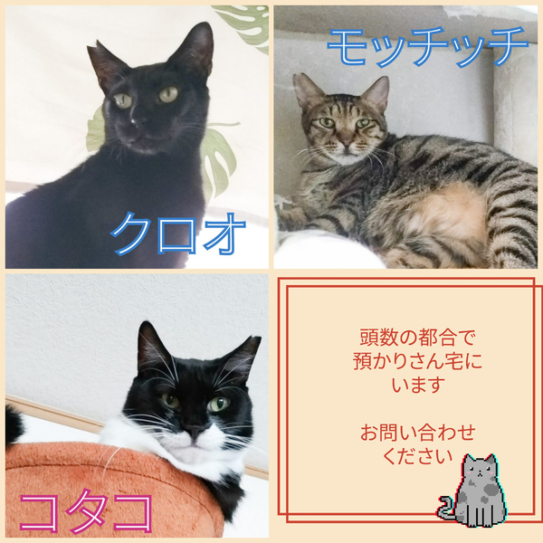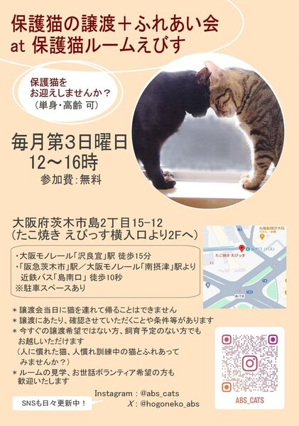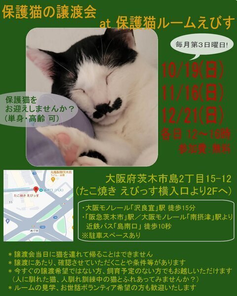 | イベント内容 | 毎月第3日曜日、ずっとのお家を待つ子たちの譲渡会です! 1歳未満の仔猫も参加します。 募集ページの他、Instagram/X/Threadsに現在ルームにいる子たちの最新情報を掲載しています。 (不定期ですが、アメブロにてSNS投稿のまとめページを作成中です) 募集ページ未掲載の子たちにも会っていただけます。 譲渡希望や飼養予定がなくとも、「猫たちに会いたい!」「保護猫ボランティアをしてみたい!」という方も大歓迎です。 猫たちの人馴れ訓練にもなりますので、どうぞ気軽にお越しください。 ※参加予定の猫は体調により参加できない場合があります。予めご了承ください ※当日猫を連れて帰るこ事はできません ※複数台分の駐車場がありますが、満車の際は少しお待ちいただくなどご協力をお願いいたします |