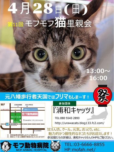| イベント内容 | 4月28日(日)江東区南砂のモフ動物病院さんにて「第11回モフモフ猫里親会」子猫から中猫から成猫迄沢山の猫達が参加 日時 4/28(日)13:00〜16:00 会場 モフ動物病院(江東区南砂3-13-5 ☎03-6666-8855) アクセス 東西線南砂町駅2a出口より徒歩4分(南砂三丁目公園側が病院の入り口になります) 参加団体 浦和キャッツ 病院内での猫里親会です。お医者様もいてくださいますのでご質問等も出来ます。 室内での開催なのでゆっくりと猫と触れ合って頂けます。 子猫から中猫から成猫さんまでいろいろな世代の子達が沢山参加予定です。 ぜひ足をお運び下さい。 譲渡にはお願いごとがございます。譲渡条件をご確認下さい。 浦和キャッツ「http://urawacats.blog133.fc2.com/」をご覧下さい。 参加猫達は 浦和キャッツ http://urawacats.blog133.fc2.com/ または 翔べ!しっぽの猫たち https://ameblo.jp/shippocats-ganba2016/ をご覧下さい。 不幸な犬や猫が沢山います。 浦和キャッツは猫の保護活動をしていますが助けられる猫はほんの少し。 なんとか保護出来た子はみんな幸せへと送り出したいと強く思い活動しています。 猫と暮らしたいと思われましたらぜひ保護猫を家族に迎えて頂けます様に。 *今回はフリマ同時開催致します。売り上げは猫たちの医療費などに充てます。 |