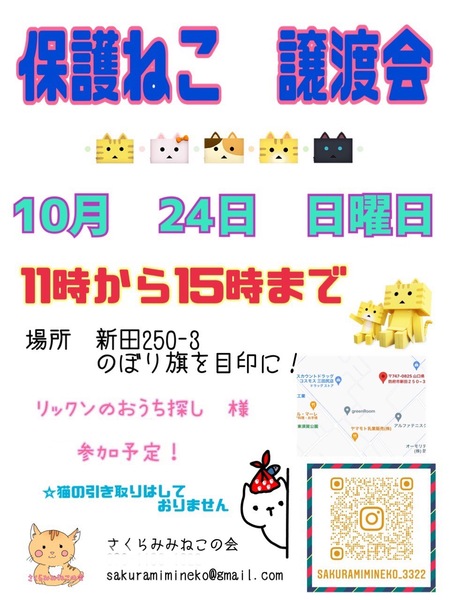 | イベント内容 | 防府市でTNR活動している「さくらみみねこの会」と譲渡ボランティア「リックンのおうち探し」の共催です。 TNRの現場で保護した子猫達、保健所からレスキューした子猫達などが里親さんを待っています。 猫ちゃん達は写真で見るより実際に見てもらった方が可愛いと思います。ぜひ足をお運びいただいて、運命の子との出会いを見つけてください。 *譲渡には条件がありますので、気になる子がいましたらお問い合わせください。 *参加予定ねこちゃんは当日変更になる場合があります。 *感染症予防対策は会場でも行っておりますが、各自でも宜しくお願い致します。 *入場の際はマスク着用の上、検温や手指消毒にご協力お願い致します。 *新型コロナウイルス感染拡大状況によっては急きょ中止になる場合もあります。 |