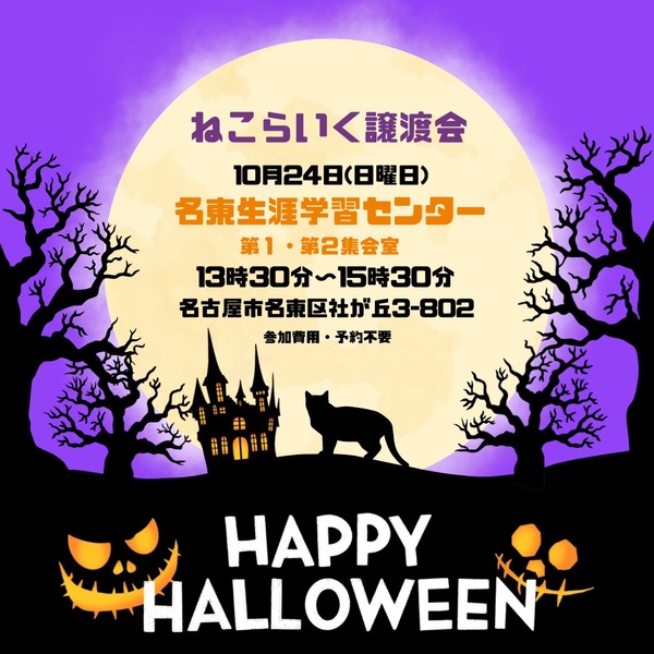 | イベント内容 | 「猫の譲渡会」 日にち:2021年10月24日(日) 時間 :午後1時30分~3時30分 会場 :名東生涯学習センター 2階 第1.2集会室 名古屋市名東区社が丘3-802 予約不要です *駐車場有(300円/日) 満車の場合は猪高緑地公園駐車場(無料)も ご利用になれます 生涯学習センターの受け付けに案内用地図が 用意されています 主催:ねこらいくnenet https://nekonetwork.com/ 募集猫中の猫は https://nekolike.amebaownd.com/ ―------- *子猫参加します 上記ブログで紹介しています 猫の急な体調変化により参加できない 場合もあります。 ご了承いただきますようお願いします。 実際に猫を見てから考えたい 飼育の仕方について質問したい・・・など すぐに決められない方でも結構です ぜひ、譲渡会におこしください 〇室内飼い、家族全員の同意、治療費の負担など お願いごとがあります 〇1~2週間のお試し飼育期間があります 〇当日、猫を連れて帰ることはできません *感染症対策を実施しています ・会場入出時の手の消毒、検温にご協力ください ・常時、窓を開け換気をしています ・スタッフはマスクを着用し、ご入場の方にもマ スクの着用をお願いしています ・室内への入場は一定の人数とさせていただきます |