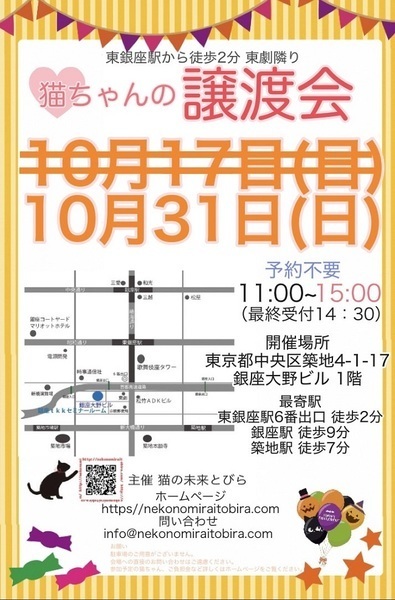 | イベント内容 | 東銀座で保護猫の譲渡会を開催しています「猫の未来とびら」です♪ 恵まれない環境にいる猫たちが未来へのとびらを開いて幸せなご縁に繋がる橋渡しをしていきます。 たくさんの猫ちゃんと保護主・スタッフ一同みなさまのご来場を心よりお待ちしています! 子猫ちゃん〜成猫ちゃんまで参加します♪ ※ご来場頂く方と私たち保護主、スタッフの安心と安全の為、感染リスクを限りなく低減させる為、私たちが出来うる対策をしてお待ちしております※ 【ご来場いただく皆様には下記についてお願い致します】 ★不織布マスクの着用をお願い致します。 (マスク着用のない方は入場出来ません) ★譲渡会場にお入り頂く前に検温・手洗いと手の消毒、検温をお願い致します。 ★ソーシャル・ディスタンス(人と人との間隔を開ける)をお願い致します。 ★熱のある方や体調の優れない方は譲渡会への来場を見合わせて頂けますよう、お願い致します。 ★来場者数によりましては人数制限もありますので長時間お待たせてする場合もございます。 予めご了承下さい。 コロナウイルス感染拡大防止の為、厳しいお願いで大変恐縮ですが何卒ご理解とご協力、ご了承をいただけますようお願い致します。 ★☆★★☆★★☆★★☆★★☆★★☆★★☆★★☆★★☆★ ★開催日時 2021年10月31日(日) 11:00~15:00 (最終受付 14:30) ★子猫希望者多数の場合、11時00分より整理券を配布致します。 ★会場 東京都中央区築地4-1-17 銀座大野ビル 1階 (東劇となり) ★最寄駅 東銀座駅 6番出口 徒歩2分 銀座駅 徒歩9分 ・築地駅 徒歩7分 駐車場は当ビルの駐車場または近隣のコインパーキング等をご利用ください。 会場への直接のお問い合わせはご遠慮くださいませ。 ★☆★★☆★★☆★★☆★★☆★★☆★★☆★★☆★★☆★ コロナ禍のため、猫ちゃんとの触れあいはご遠慮頂いております。 里親様・猫ちゃんが双方、幸せな家族になれるよう保護主・スタッフがサポート致します。 ご不安な事はお気軽にご相談ください。 入場無料です。事前のご予約は不要です。 当日猫ちゃんの引き渡しはございません。 後日、保護主が里親様宅へお届けいたします。 ※参加予定猫ちゃんは、急な体調不良等で不参加になる場合もございます。 開催当日の朝、当会ブログにて不参加の最新情報を掲載致しますのでご確認をお願い申し上げます。 ◇譲渡に関してのお願い・基本条件 1.家族の一員として終生最期まで愛育下さい。 2.完全室内飼い・ペット可のお住まい(契約書を拝見致します) 3.脱走防止対策 4.避妊・去勢手術 5.里親様のご自宅へのお届け 6.譲渡誓約書への署名捺印・身分証明書の提示 7.医療費譲渡金のご負担 8.定期報告 9.トライアル期間有り ※保護主により譲渡条件は異なりますので会場で直接ご相談ください。 60才以上の方のみのご家庭、未成年の方、単身の方、同棲中の方、 小学生低学年以下のお子様のいる方、必要な脱走対策を施していただけない方は譲渡が出来かねますのでご了承ください。 仔猫の場合は主にお世話される方のご年齢は55歳までとさせて頂きます。 オーバーする方はご相談くださいませ。 小さな子猫の譲渡は体重が1kgになってからのお届けやお留守番の無い(少ない)ご家庭を希望いたします。 動物も病気になったり、年老いた場合には介護が必要になる場合がございますので、その時にきちんと必要な医療費を捻出出来る、経済力がある里親さまへの譲渡となります。 医療費譲渡金に関しましては詳しくはホームページの 【譲渡に関してのお願い】【譲渡の流れ】をご覧くださいませ。 ~主催 猫の未来とびら~ |