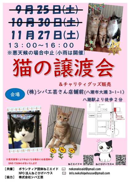 | イベント内容 | 八潮で保護された猫たちの里親さんを募集してます。 今回は生後3~6か月の子猫が15匹位参加しますが、大人猫さんも参加します。 保護猫を迎えようと検討されている方はもちろん、NPO法人ねこひげハウスさんではチャリティグッズの販売もありますので、ぜひお立ち寄りください。 八潮駅から徒歩2分です。 お問い合わせはメールで nekonekoaid@gmail.com までお気軽にどうぞ 譲渡には *終生愛情を持って飼育して頂ける方 *完全室内飼育 *他東京都、埼玉県の譲渡条件に準じた条件があります *譲渡費用として医療費等の一部のご負担をお願いしています。 |