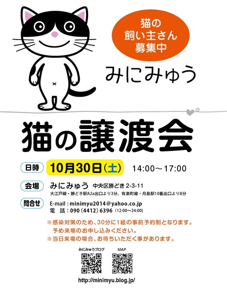 | イベント内容 | 10月30日(土)14時〜17時 中央区勝どき2-3-11 みにみゅうシェルターにて、譲渡会を開催します。 密を避けるため、30分ごとの予約制にさせていただきます。 予約 申し込み メール:minimyu2014@yahoo.co.jp 電話:090 4412 6396(竹内)14時〜24時 又は、みにみゅうホームページ 譲渡会のお知らせ から 予約申し込みフォームより ご予約ください。 |