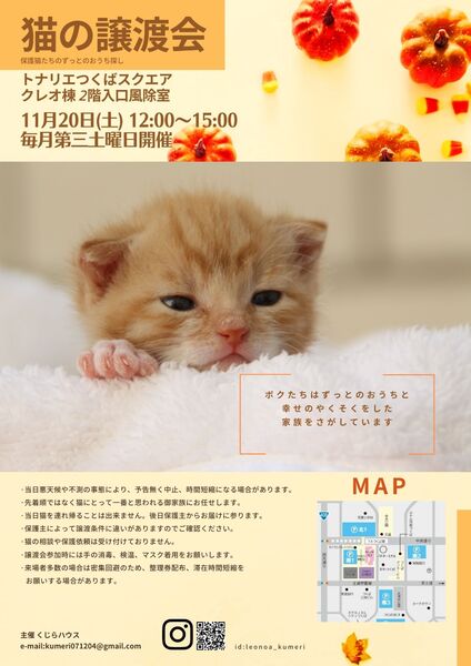 | イベント内容 | 個人ボランティアが集まって保護猫たちのずっとのおうちを探します。参加する猫達は全て医療にかけられた元気な子達です。一頭の里親という選択をするともう一頭の子が救えます。お家を持たない猫達が家族を求めて参加します。保護猫達に会いに来てください。 ☆当日はチャリティー品販売もあります。売上は全て保護猫達の為に使わせて頂きます。 ☆保護猫たちの為にご支援をお願いします。 犬猫用ドライフードやウエットフード おやつ(未開封、賞味期限内の物) ホッカイロ フェイスタオル バスタオル(洗濯済みの物) をご支援頂けると有難いです。ボランティアの保護猫達や茨城県動物指導センターへ届けます。 ⚠︎お願い⚠︎ 当日はコロナ対策をしお迎え致しますが、来場者の皆様にも検温、消毒、マスク着用をお願いしております。蜜を避ける為に退出をお願いする場合も御座いますがなにとぞご理解ください。 沢山の猫たちが皆様のご来場をお待ちしております! |