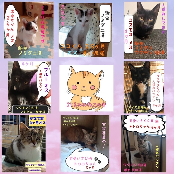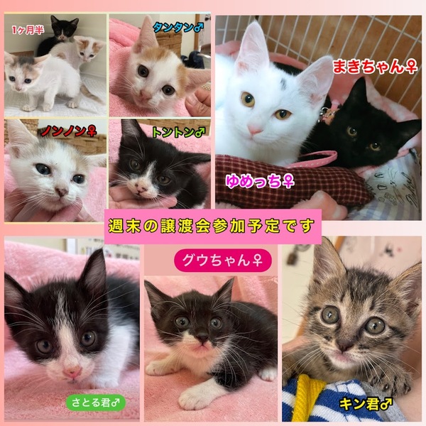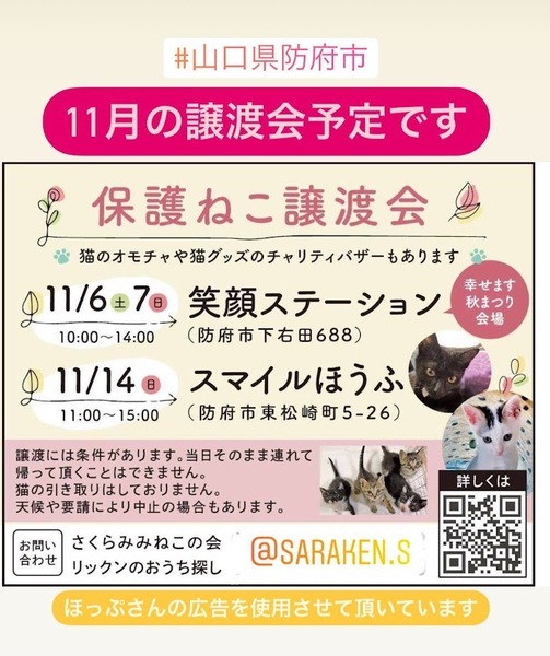 | イベント内容 | 日時 11月6日(土) ~7日(日) 10時~14時 まつりは9時から 場所 防府市大字下右田688 笑顔ステーション右田 (右田小西) 幸せます秋まつり会場にて *駐車場あり *譲渡には「完全室内飼育」「避妊去勢の実施」などの条件があります。里親希望の方はアンケートにご記入をお願いします。 *参加予定の子は天候や体調によって写真参加となる場合があります。 *チャリティバザーもあります! ●手作り猫キッカー、猫三角オモチャ、ペット用品、犬柄、猫柄のハンドメイド品 *皆さんのお越しをお待ちしています。 *画像はほっぷさん作成のものを使用させて頂いております。 *猫の引き取りはしておりません。 11月14日にも防府市「スマイルほうふ」での保護ねこ譲渡会を予定しています。 |