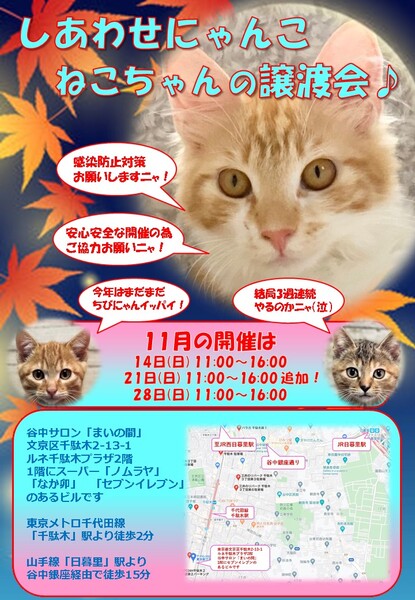 | イベント内容 | 「しあわせにゃんこ」は行き場のない猫ちゃんと里親様との出会いの場を提供するグループです♪ 子猫も成猫もハンデのある猫もみんな新しい家族を待っています♪ みなさまのご来場を保護主、スタッフ一同心よりお待ちしております♪ 開催にあたりソーシャルディスタンスを守る為、各種制限等を設けております。 ※詳しくはホームページ譲渡会情報をご確認願います。 http://www.shiawasenyanko.net/jyoutokai.html ◆開催日/開催時間◆ 2021年11月28(日) 11:00~16:00 2021年もあっという間にあと2ヶ月( ゚Д゚) でもにゃんこはまだまだいっぱいご縁を待ってます! 参加希望にゃんこが多すぎてまさかの3週連続開催です! ご希望の猫ちゃんがいらっしゃる場合は11時30分までに受付をお願い致します。 複数のお申し込みがある場合は11時30分で受付を終了させて頂く場合がございます。 受付をされた全ての里親様とお見合いをさせて頂きます。 ※先着順ではございません。 ※当日、猫ちゃんを連れて帰ることは出来ません。 後日調整のうえ保護主が里親様宅へお届けいたします。 ◆会場◆ 東京都文京区千駄木2-13-1 ルネ千駄木プラザ2階 谷中サロン「まいの間」 ※詳しいアクセスはホームページ案内図をご覧下さい http://www.shiawasenyanko.net/mapmainoma.pdf 谷中サロン「まいの間」の情報はこちら http://neko-to-kyo.com/#maima ◆交通手段◆ 東京メトロ千代田線「千駄木」駅より徒歩2分 JR山手線「西日暮里」駅より徒歩12分 JR山手線「日暮里」駅より谷中銀座経由で徒歩15分 ※お車でご来場の際、駐車場のご用意はございません。 近隣のコインパーキング等をご利用ください。※近隣に沢山あります。 いつ里の掲載参加猫一覧はこちらから https://satoya-boshu.net/mypage/foster_list.php?@ps@=none アメーバブログの里親募集にゃんこはこちら https://ameblo.jp/shiawasenyan-ko/theme-10092719565.html ◆猫ちゃんとのお見合い◆ 掲載している猫ちゃんは基本的に譲渡会場でのお見合いのみとなります。 譲渡会への参加が決定している猫ちゃんはその譲渡会で里親様が決定しなかった場合のみ保護主宅でのお見合いが可能となります。 自宅お見合いを希望される里親様はメール(info@shiawasenyanko.net)にてご相談ください。 ◆当譲渡会では猫ちゃんと里親様のスキンシップを大切にしています◆ 新しい家族として20年以上いっしょに暮らしていく猫ちゃんです。 譲渡会場でたくさんの猫ちゃんと触れ合って良きパートナーを見つけてください。 はじめて猫ちゃんを迎える不安や先住猫ちゃんとのトライアルの注意点、猫ちゃんと里親様の暮らし方など気軽にご相談ください。 経験豊富な保護主や猫大好きスタッフがアドバイスさせていただきます。 ◆子猫ご希望の里親様◆ 子猫は急な下痢や発熱等により体調が急変し、数時間対応ができなかっただけでも命を落とす事があります。 その為、当譲渡会では月齢によりお留守番のない又は少ないご家庭への譲渡に限らせて頂いております。 また里親様と子猫ちゃんが安心してトライアル期間を過ごせるよう体重が1㎏程になってからのお届けとさせて頂いております。 ◆里親希望のみなさまへ◆ ご家族の皆様で生涯、家族の一員としてたっぷり愛情を注いでくださるご家庭をお待ちしております。 下記に該当する希望者様へ ・独身、単身者の方 ・友人同士、同棲でのお住まいの方 ・高齢者のみのご家庭の方 は、ご相談の上、譲渡を判断させて頂きます ・適正飼育の不可能な方 ・脱走防止対策を考えて頂けない方 ・定期報告の不可能な方 は、ご遠慮下さいますようお願い致します ◆ご負担頂く費用について◆ 譲渡の際に譲渡負担金(医療費の一部、譲渡金、お届け時の交通費)を里親様にご負担頂く事により 過酷な状況にいる猫ちゃんを保護し新しいご家族の元へ送り出す事ができています。 皆様のご理解とご協力にボランティア一同、心より感謝しております。 ご負担頂く医療費につきましてはホームページに詳しく記載させて頂いております。 http://www.shiawasenyanko.net/onegai.html しあわせにゃんこホームページ http://www.shiawasenyanko.net メールでのお問い合わせ info@shiawasenyanko.net |