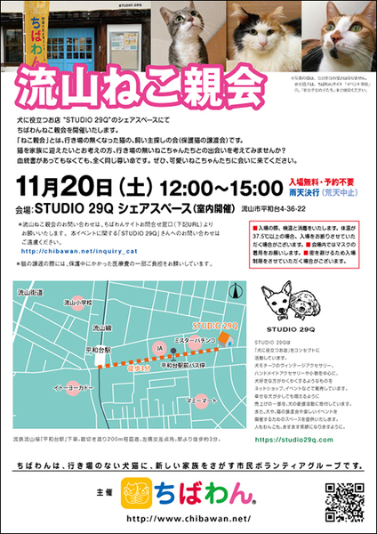 | イベント内容 | 千葉県流山市のSTUDIO 29Q シェアスペースをお借りして、ねこ親会を開催します! 是非かわいい猫に会いに来てくださいね♪ 詳細はこちらからどうぞ→http://chibawan.net/event/20211120-nagareyama-cat 【新型コロナウィルス感染予防のため、ちばわんからのお願い】 ①会場内ではマスクの着用をお願いします。 ②入場の際、検温と消毒をお願いします。体温が37.5℃以上の場合、入場をお断りする場合があります。 ③ご予約は不要ですが密を避けるため入場制限をさせていただく場合があります。 2021年11月20日(土)12:00〜15:00 STUDIO 29Q シェアスペース 千葉県流山市平和台4-36-22 流鉄流山線「平和台駅」下車。踏切を渡り200m程直進、左側交差点角。駅より徒歩約3分。 駐車場はございません。当日お車の方は近隣のコインパーキングをご利用ください。 【会場内でのお願い】 ・当日、会場内への犬猫等の愛玩動物の同伴は出来ません。 ・譲渡が決定した場合、後日猫をご自宅へお届けいたします。当日猫をお引渡しすることはございません。 【当日の流れ】 ①ご予約は不要ですが密を避けるため入場制限をさせていただく場合がございます。会場ではちばわんボランティアは名札をつけておりますのでどうぞご遠慮なくお声をおかけください。 また、募集中の猫のそばには預かりボランティアが控えておりますので遠慮なくご質問ください。 ②気に入った猫がいましたら、該当の預かりボランティアとお話しのうえ、「申し込みアンケート」にご記入ください。 (前日までにメールでアンケートを送信してお申し込みいただくこともできます) ◆「ねこ」アンケート送信先:【ねこ親】お申込みアンケート ③アンケート内容を拝見し、アンケート担当者がお話しさせていただきます。 ④原則として一両日中に預かりボランティアからお返事の連絡をさせていただきます。 ⑤ご縁が成立した場合は後日、こちらからご自宅まで猫をお届けし、約1ヶ月のお試し生活に入っていただきます。 お届けの際に書面での譲渡契約書を交わします。 ※ワクチン・去勢不妊手術など保護ねこにかかった費用は家族になるねこ親様にもご負担をお願いしています。 【お願い】 ①ねこ親会・いぬ親会当日の飛び入り参加は受け付けておりません。 犬猫を保護した、飼い主を失った犬猫がいる、新しい家族を探したい犬猫がいるなどの場合は「こんな時どうする?」をお読みください。 ◆こんな時どうする? ②会場は室内ですが、脱走逸走の恐れがあるため、猫はケージから出さないでください。 (ご希望の猫に触れてみたいなどのご希望がございましたらお近くのちばわんボランティアにお声をおかけください) ③参加する猫の中には臆病な性格の子がいます。お子様だけでの入場はご遠慮いただきます。お怪我防止のためにご理解ください。 今後も問題なくねこ親会を続けられるよう皆様のご協力をお願いいたします。 |