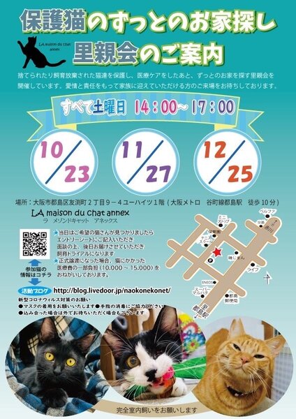 | イベント内容 | オープンシェルターにて、ユルユルと小規模の里親会ですがアットホームな雰囲気の中開催しております。怖がりさんでなければ、お散歩している猫さんを見て頂いたり、抱っこも短時間であればオッケーです。なるべく触れ合って頂き、しっかりとお話をさせて頂ける空間でと開催しております。 4ケ月位の子猫さんから、しっかり大人猫さんまでの沢山の保護猫さん達が参加いたします。ぜひご来場くださいね。 当里親会は猫さんの年齢層や性格によっては、単身者の方へも譲渡しております。ご相談だけでも大丈夫です!猫さんとの生活に対する不安などもしっかり解消した上で、飼育トライアルに進んで頂きたいと思います。 新型コロナウィルス対策としましてマスクの装着、手指の消毒と検温をお願いしております。会場内が混み合いましたらお待ち頂く事がありますので、ご協力宜しくお願いいたします。 参加猫さん情報はブログ『annexニャンコのずっとのお家探し』をチェックして下さいねhttp://blog.livedoor.jp/naokonekonet/lite/ ・エントリーの際にご確認のため身分証明書のご提示のみ(コピーなどは頂戴いたしません)お願いしております。 ・当日は猫を連れ帰ることはできません。 ・正式譲渡になった際には、猫にかかった医療費の一部負担をお願いしております(10,000〜15,000円)。 11月27日(土曜日) 14〜17時 大阪市都島区友渕町2-9-4 ユーハイツ1階 LA maison du chat annex 地下鉄谷町線 都島駅より徒歩10分 |