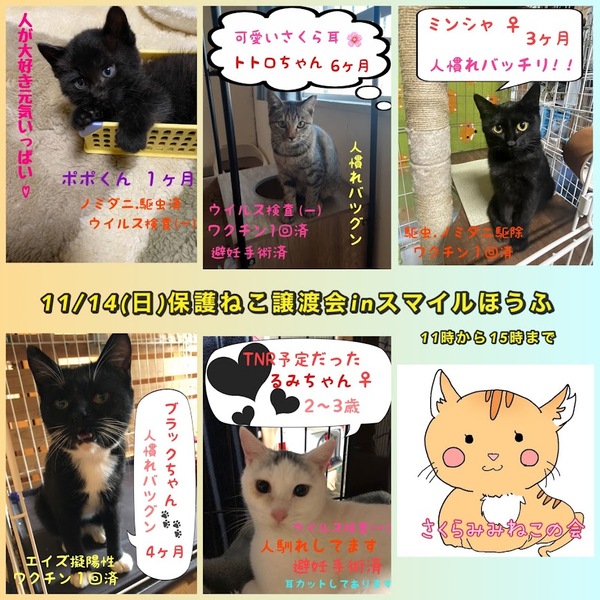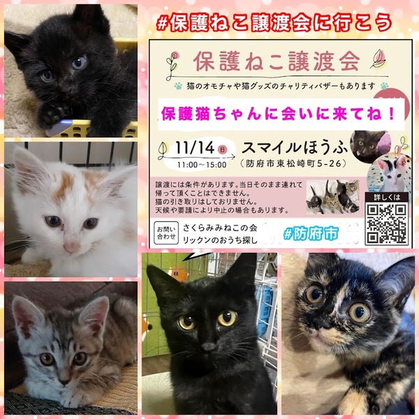 | イベント内容 | 防府市の『スマイルほうふ』で毎月第2日曜日に「保護ねこ譲渡会」が開催されます。 時間は11時から15時まで。 防府市でTNR活動している「さくらみみねこの会」と譲渡ボランティア「リックンのおうち探し」の共催です。 TNRの現場で保護した子猫達、保健所からレスキューした子猫達などが里親さんを待っています。 猫ちゃん達は写真で見るより実際に見てもらった方が可愛いと思います。ぜひ足をお運びいただいて、運命の子との出会いを見つけてください。 *譲渡には条件がありますので、気になる子がいましたらお問い合わせください。 *参加予定ねこちゃんは当日変更になる場合があります。 *チャリティーバザーもあります。 *感染症予防対策は会場でも行っておりますが、各自でも宜しくお願い致します。 *画像はほっぷさん作成のものを使用させて頂いております。 *入場の際はマスク着用の上、検温や手指消毒にご協力お願い致します。 *新型コロナウイルス感染拡大状況によっては急きょ中止になる場合もあります。 |
