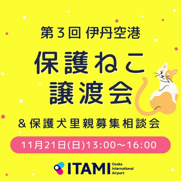 | イベント内容 | 第3回 伊丹空港✈保護ねこ譲渡会 https://bit.ly/3qmBCwm ☆彡空港と譲渡会の異色のコラボが実現! 子猫成猫合わせて約30匹の保護ねこ達が、伊丹空港という 夢と希望いっぱいの場所で、あなたから渡される、 幸せのチケットを待っています。 ☆彡参加予定ねこの紹介↓↓ https://onl.tw/yfQ1v95 【日時】2021年11月21日(日) 13:00~16:00 ・上限30名、30分×5回の入れ替え制 13:00〜、13:35〜、14:10〜、14:45〜、15:20~ 【場所】伊丹空港(大阪空港) 北ターミナル4F「星の間」 ※駐車場あり (30分以内無料、以後30分/\150) 【参加条件等】 保護猫譲渡会への入場には整理券が必要です。11:00から「星の間」にて配布いたします。 ☆同時開催(こちらにご参加の方は整理券なしでご入場頂けます) 【保護犬里親募集相談会】写真による保護犬の里親募集です。 【チャリティーグッズ販売会】利益はすべて猫を救う活動に使います。 【ドネーションビン設置】ご自宅で使わなくなったペットフードや、 ペットグッズの寄付を受付けます。ご協力お願い致します。(未使用品に限る) 主催:teamねこのて 共催:特定非営利活動法人C.O.N、オープンシェルター保護猫ふみふみ ペットアダプションセンター宝塚 協力:関西エアポート株式会社 問合せ:kaizaru7★yahoo.co.jp (★を@に変えて下さい) |