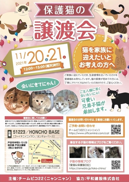 | イベント内容 | 日時:11月21日(日曜日)12:00〜15:00 会場:51223/HONCHO BASE(ゴーイチニイニイサン/ホンチョーベース) 住所:戸田市本町5-12-23 JR埼京線 戸田公園駅(西口)徒歩3分の戸建てギャラリー オシャレな室内で、仔猫ちゃんに触れ合っていただけます。 ※戸田公園駅西口ロータリーを出て、オリンピック通りの本町二丁目交差点を横断して、直進してください。 立て看板のある細い道を左折して、すぐ右折してください。お車の方は、付近のコインパーキングをご使用ください。 ※状況によっては中止になる場合もございますので、最新情報はブログでご確認ください。 【参加する仔猫たち】 参加する子猫の情報は、チームピコ22(ニャンニャン)のサイトかブログをご覧ください。 ・チームピコ22(ニャンニャン)→ https://www.officemirai.com/cat ・ブログ → https://ameblo.jp/toko-chino/ 【譲渡会に関してのお願い】 新型コロナウイルス感染予防策を万全に行い実施いたしますので、 以下、皆様のご理解とご協力を賜りますよう、何卒お願い申し上げます。 ・会場内はマスクの着用をお願い致します。 ・ご出発前に検温をお願いいたします。 ・会場にお入り頂く前に検温をお願い致します。 ・受付に消毒液を設置していますのでご利用くださ い。 ・ご来場者の人数によってはお待ち頂く事もあります。 ・ご協力を頂けない場合、参加をお断りさせて頂く場合がございます。 皆様のご来場を心よりお待ちしております。 |