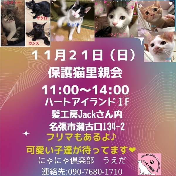 | イベント内容 | 猫の里親会を開催いたします! フリマもございます! 可愛い子達が運命の出会いを待っています! 是非ご来場ください! #三重県 #三重 #伊賀市 #伊賀 #名張市 #名張 #保護猫 #拡散希望 #cat #rescue #保護#里親募集 #里親募集猫 #ずっとのお家#讓渡会 #子猫 #成猫#猫#里親会 |