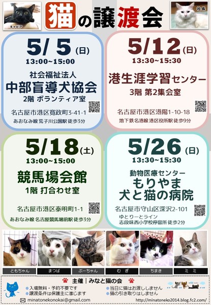 | イベント内容 | =みなと猫の会 第195回譲渡会のお知らせ== 新しい家族を待つ猫たちに 会いに来ませんか? ◆ペットショップへ行く前にぜひ譲渡会へ◆ トイレトレーニングや 基本的な健康診断を終わらせた 生後2ヶ月~9才くらいの 猫たちが大集合! ○主 催 みなと猫の会 ○日 時 2019年5月18日(土)13:00~15:00 ○場 所 競馬場会館 1F打合せ室 愛知県名古屋市港区泰明町1-1 あおなみ線「名古屋競馬場前」駅より徒歩3分 ※大型無料駐車場有 https://goo.gl/maps/rCtj7cmRKTL2 ○参加猫について ・参加している猫は、ワクチンや駆虫等の基本治療を済ませています。 また、年齢に応じて避妊去勢手術を行っています。 ・参加予定猫が体調不良などで急遽不参加になることもあります。 ○ご来場の皆様へ ・譲渡会の見学は入場無料・予約不要です。 ・当日に猫をお渡しすることはありません。 後日ご自宅までお届けに伺います。 ・一週間から二週間のトライアル期間後、正式譲渡となります。 ・トライアル及び譲渡の際には 完全室内飼い・ご家族の同意・脱走防止策・ アンケート記入など諸条件がございます。 ・里親様には治療費の一部ご負担をお願いしております。 これ以上不幸な猫を増やさないための 治療費とさせて頂きますので何卒ご理解ください。 ・非会員の個人保護者も参加しています。 譲渡条件やトライアルは猫の保護者に準じます。 ・譲渡会の流れ http://minatoneko2014.blog.fc2.com/blog-entry-11.html ○参加猫情報は随時更新中! ↓↓参加猫一覧↓↓ http://minatoneko2014.blog.fc2.com/blog-entry-493.html ○猫に関する相談も受け付けています ねこについての困りごと、トラブルなどを抱えている方、 相談へいらっしゃいませんか。 ○次回以降の譲渡会予定 日時:5月26日(日)13時30分~ 場所:動物医療センター もりやま犬と猫の病院 愛知県名古屋市守山区深沢2-101 ゆとりーとライン「志段味西小学校」バス停留所 徒歩2分 ◎主催者ブログ みなと猫の会 ~こぴっと猫だより~ http://minatoneko2014.blog.fc2.com/ ◎参加者のブログ myままさんブログ「にゃんこの宝箱」 http://wagayamama.cocolog-nifty.com/jiru/ 犬白ママさんブログ「犬白日記」 http://k531.blog25.fc2.com/ uzumakinecoさんブログ「猫ときどき雨」 http://uzumakineco.blogspot.jp/ sion1226さんブログ「さとおやさがし」 http://sion1226.blog.fc2.com/blog-entry-1.html ■上記ブログに会ってみたい猫がいた!でも参加予定猫に入ってない、 どうすればいいの? ■譲渡会当日は都合が悪くて… それ以外の日に猫とお見合いがしたい! などのお問い合わせは minatonekonokai@gmail.com まで 写真1枚目 チビ太 ♂ 7才 食いしん坊でおやつ大好き! たまにシャイボーイ/// 写真2枚目 ココ ♀ 4ヶ月 抱っこよりナデナデ派 控え目で大人しい茶白女子 ☆★個性豊かな猫たちが皆様をお迎えします★☆ 猫とスタッフ一同、お待ちしております。 |