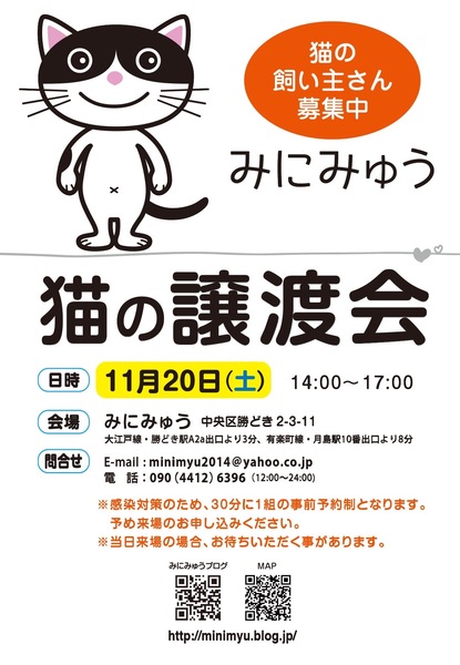 | イベント内容 | みにみゅう譲渡会 11月20(土)14時〜18時 密にならないよう、30分ごとの予約 制となっております。 当日来場も可能ですが、予約の方優先の為、お待ちいただく事があります。 生後3ヵ月〜8ヵ月くらいの仔猫が 参加いたします。 予約受付は Eメール minimyu2014@yahoo.co.jp 電話 090 4412 6396(14時〜24時) |