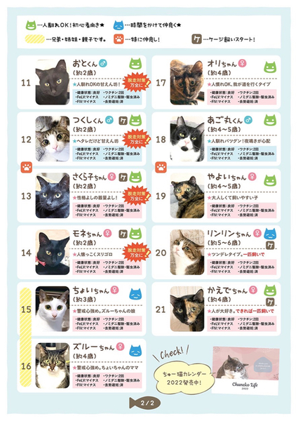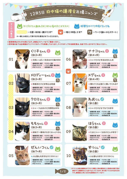 | イベント内容 | ◉子猫や大きめの子猫達も出場しますが、今回は成猫さんが多数出場します! 小さな子猫ちゃん達もかわいいですが、味わい深く、落ち着いた成猫さんの魅力をご紹介させていただきます。 出場頭数は約20匹予定です。 〓〓〓〓〓譲渡会案内〓〓〓〓〓〓 ♠︎令和3年 12月5日(日) ♠︎13時〜15時30分まで ♠︎会場は【カフェ&ワークスペース sou-zou】 ・京王線【府中駅】から徒歩5分 ・駐車場はございません。 ・お車でお越しの方は最寄りのパーキングにお願いします。 ・自転車を止めるスペースがございません。 ※会場へ直接のお問い合わせは、ご遠慮ください。 fuchu_nekonokai@yahoo.co.jpまで。 【カフェ&ワークスペース sou-zou】 http://sou-zou.jp/ 〓〓〓〓〓〓〓〓〓〓〓〓〓〓〓〓〓 フルタイムで働くお方や猫飼い初心者のご家庭の方々には、人馴れ抜群のヤングチームや落ち着いた成猫さんチームをオススメ致します。 1匹づつの詳しい情報は下記にアップしてあります。URLをクリックしてご覧ください。 (当会がどのようにして、保護猫達を譲渡会に出しているのか?をお知りいただくには、ぜひ!YouTubeちゅー猫チャンネルをご視聴いただけると幸いでございます) ちゅー猫チャンネル ↓↓↓ https://youtube.com/channel/UC4YseOceX9CQfZtgXTg83sw ◉完全予約制ではありませんが、整理券を配布し、入場制限をさせていただきます。 (コロナ感染防止の為、一組様約30分制限とさせていただきます) ◉密を避ける為に、かなり徹底した入場制限をしますので、本気で猫を迎えたい方々のみのご参加でよろしくお願い申し上げます。 ◉見学は受け付けておりませんのでご了承ください。ご支援物資なども今回は申し訳ありませんが受け付けておりません。(お気持ちだけありがたくご頂戴いたします。) ◉譲渡会に参加予定の方は、必ずこちらをご参照ください。 ↓↓↓ https://ameblo.jp/team-rose-cats/entry-12174516271.html ※譲渡会に参加予定の方は必ずこちらをご覧いただいた上ご来場をよろしくお願いしております。 特に、お子様のいらっしゃるご家族はお子様のアレルギーの有無をご明確にしていただくと選考しやすいです。 初めて猫ちゃんを迎える方も、アレルギー検査をオススメしております。(検査の結果を教えていただければ選考しやすくなりますのでぜひお願いします。) ================ 当会の譲渡会に参加する猫ちゃん達は、殆どの子達が元野良猫出身です。 アピール上手な子達もいれば、甘える事に不器用な子達など性格は様々です。 一匹づつの詳しい情報は、出場する保護猫達の紹介記事ブログをご参照ください。 |